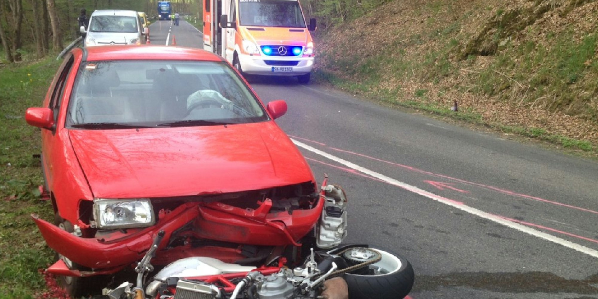Much – Schwere Verletzungen hat ein 46 Jahre alter Motorradfahrer aus Bergneustadt bei einem Unfall auf der Landstraße 350 zwischen Zeche Aachen und Bech erlitten. Er hatte nach Angaben von Zeugen zuvor schon mehrere Autos überholt und setzte kurz vor einer Rechtskurve zu einem weiteren Überholmanöver an. Er scherte kurz vor dem Scheitelpunkt der Kurve ein, weil ihm Fahrzeuge entgegenkamen. Dabei verlor er die Kontrolle über seine Maschine. und stürzte auf die Fahrbahn. Bike und Mensch rutschten auf die Gegenfahrbahn und prallten frontal gegen ein Auto, an dessen Steuer eine 57 Jahre alte Frau aus Ruppichteroth saß. Sie hatte keine Chance, auszuweichen oder zu bremsen.