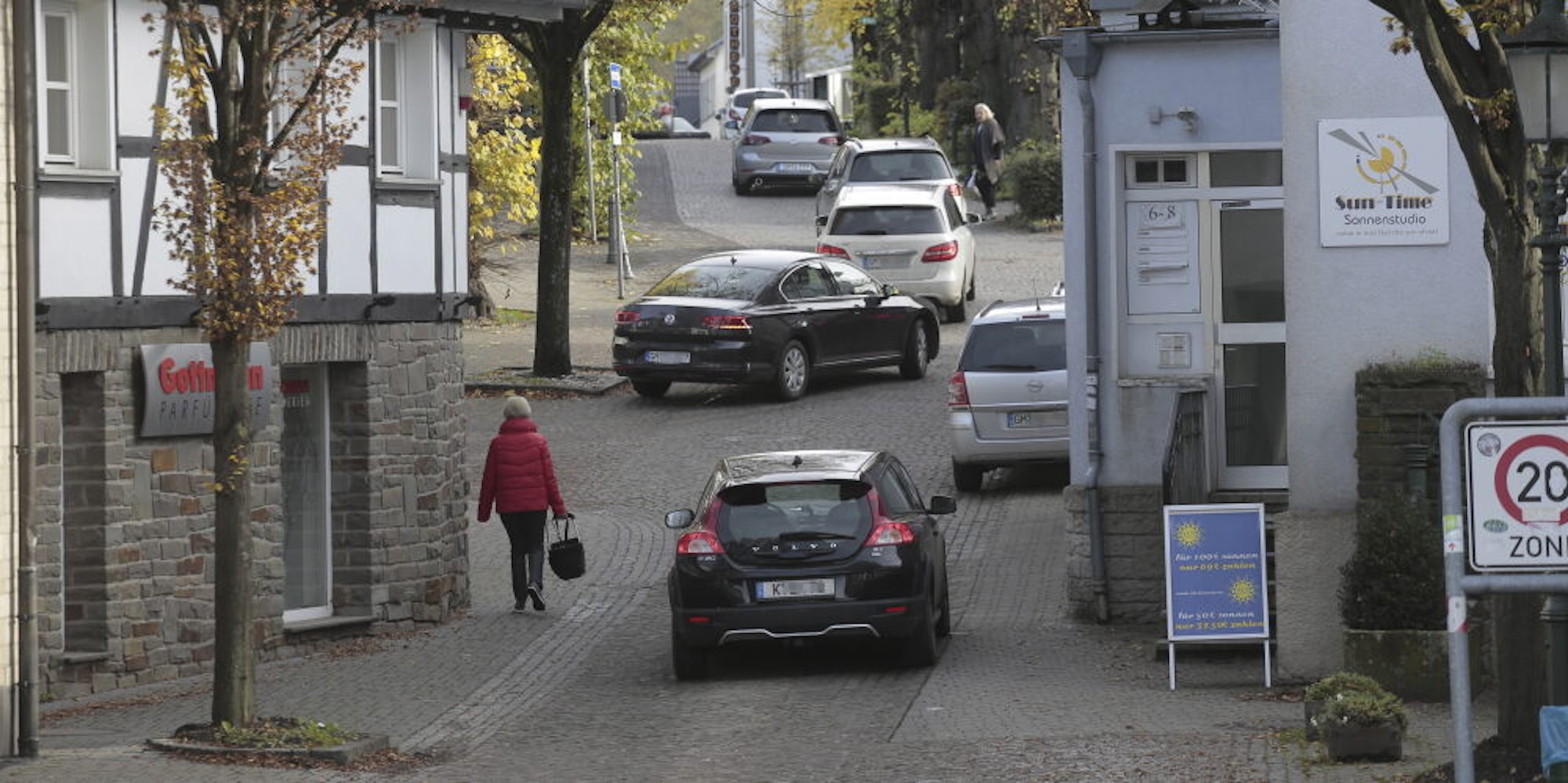 Autos und Fußgänger auf der Hauptstraße in Lindlar, dort gilt Tempo 20.