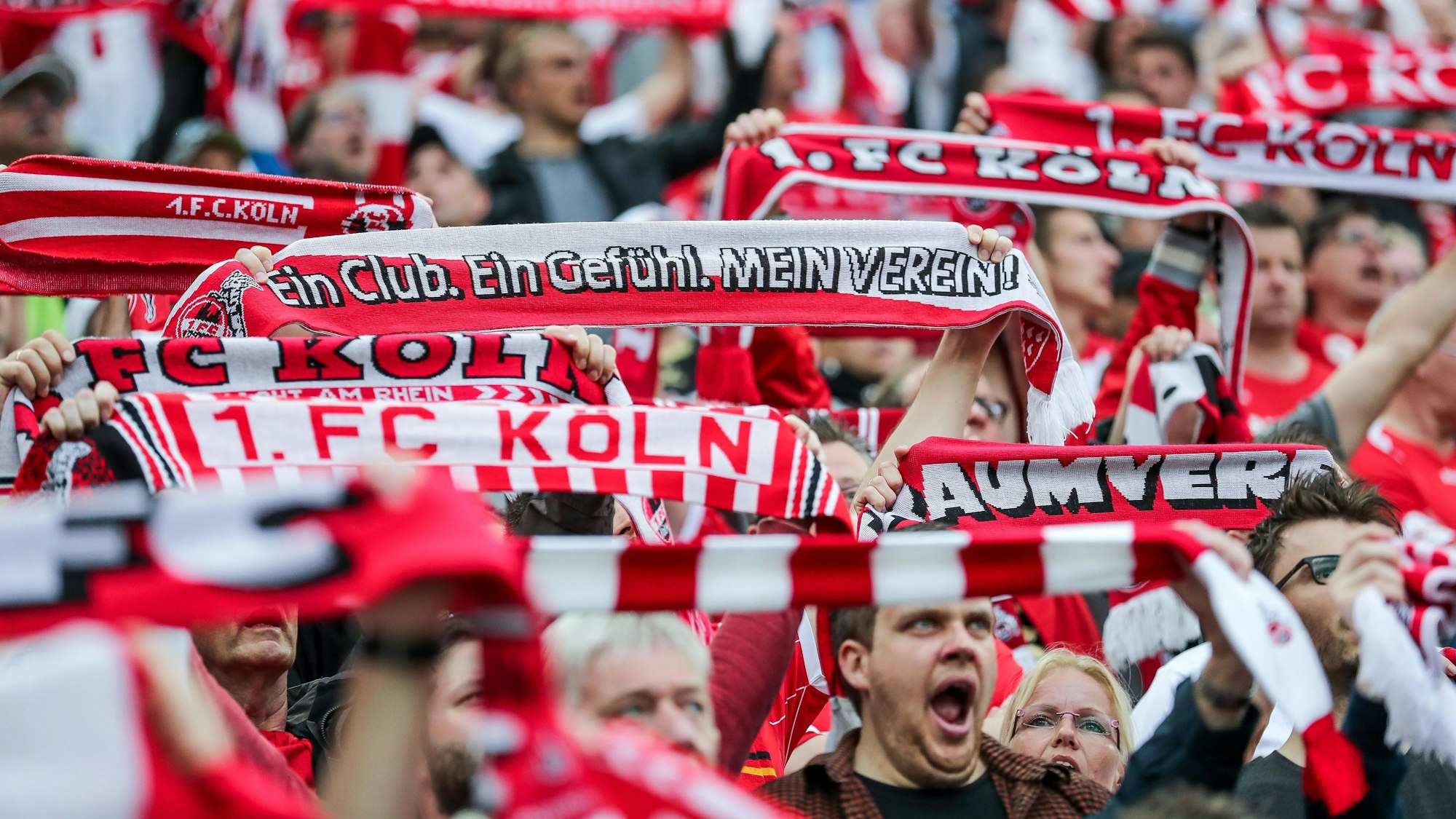 Fans des 1. FC Köln strecken ihre Schals während der Hymne in die Höhe.
