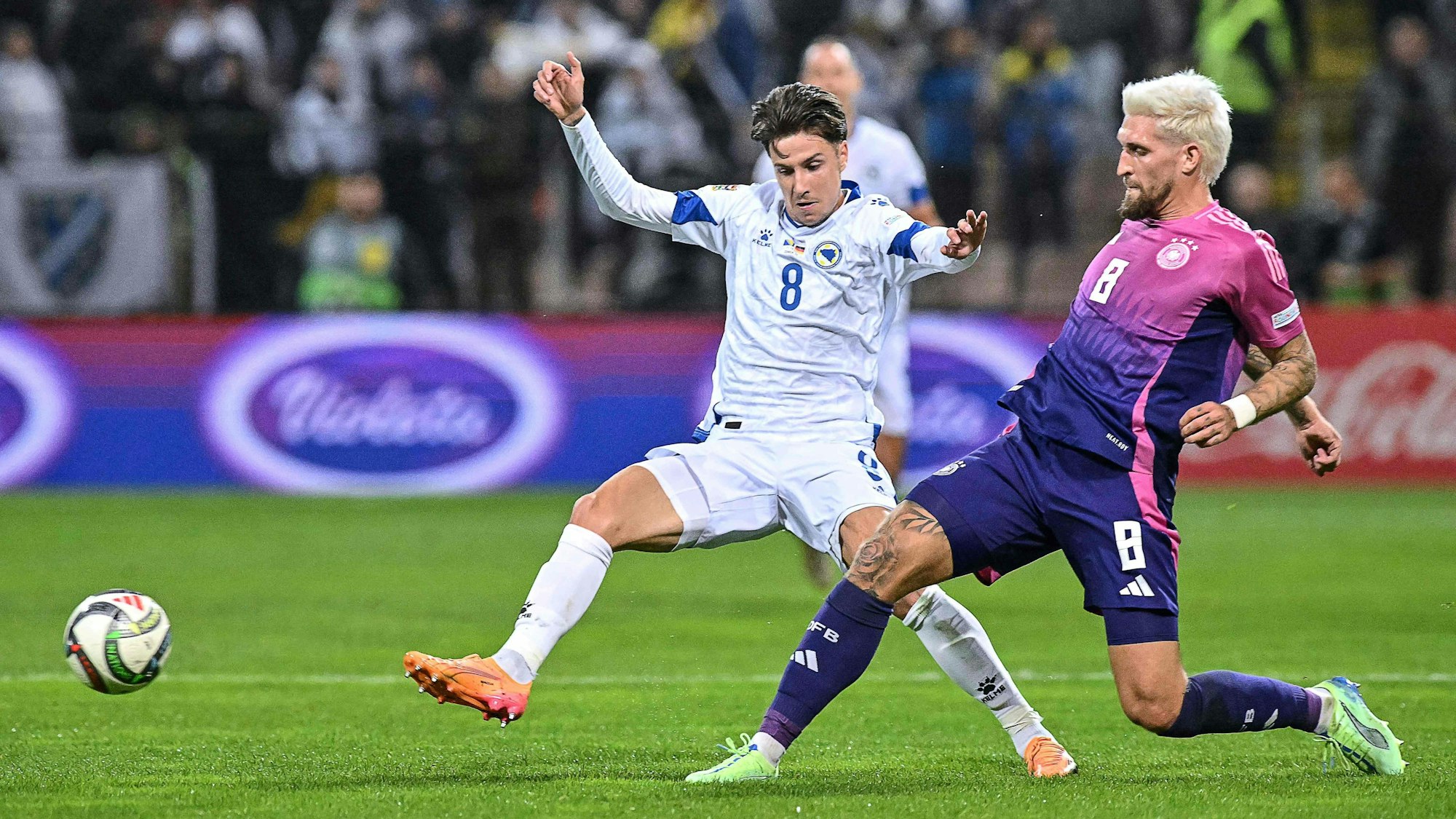 Hoch motiviert gegen das Geburtsland: Denis Huseinbasic (l./Bosnien) im Duell mit Robert Andrich (Deutschland).