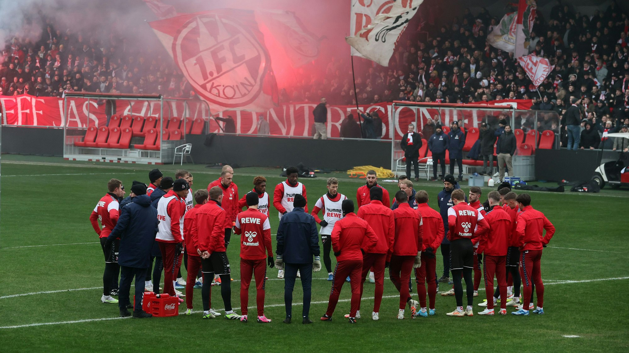 Mit Gesang, Fahnen und Feuerwerk sorgte die aktive Fanszene des 1. FC Köln beim Training am Freitag für Gänsehaut-Atmosphäre.
