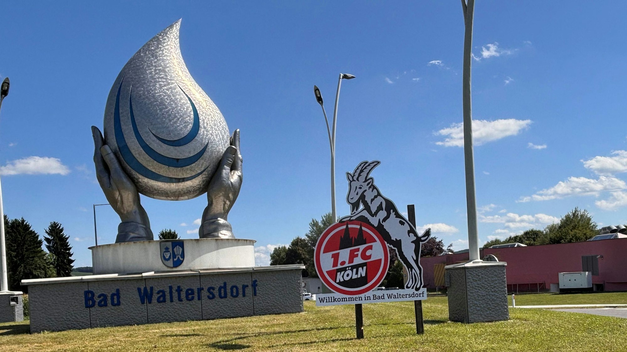Herzlich willkommen: Das FC-Wappen am Ortseingang von Bad Waltersdorf.