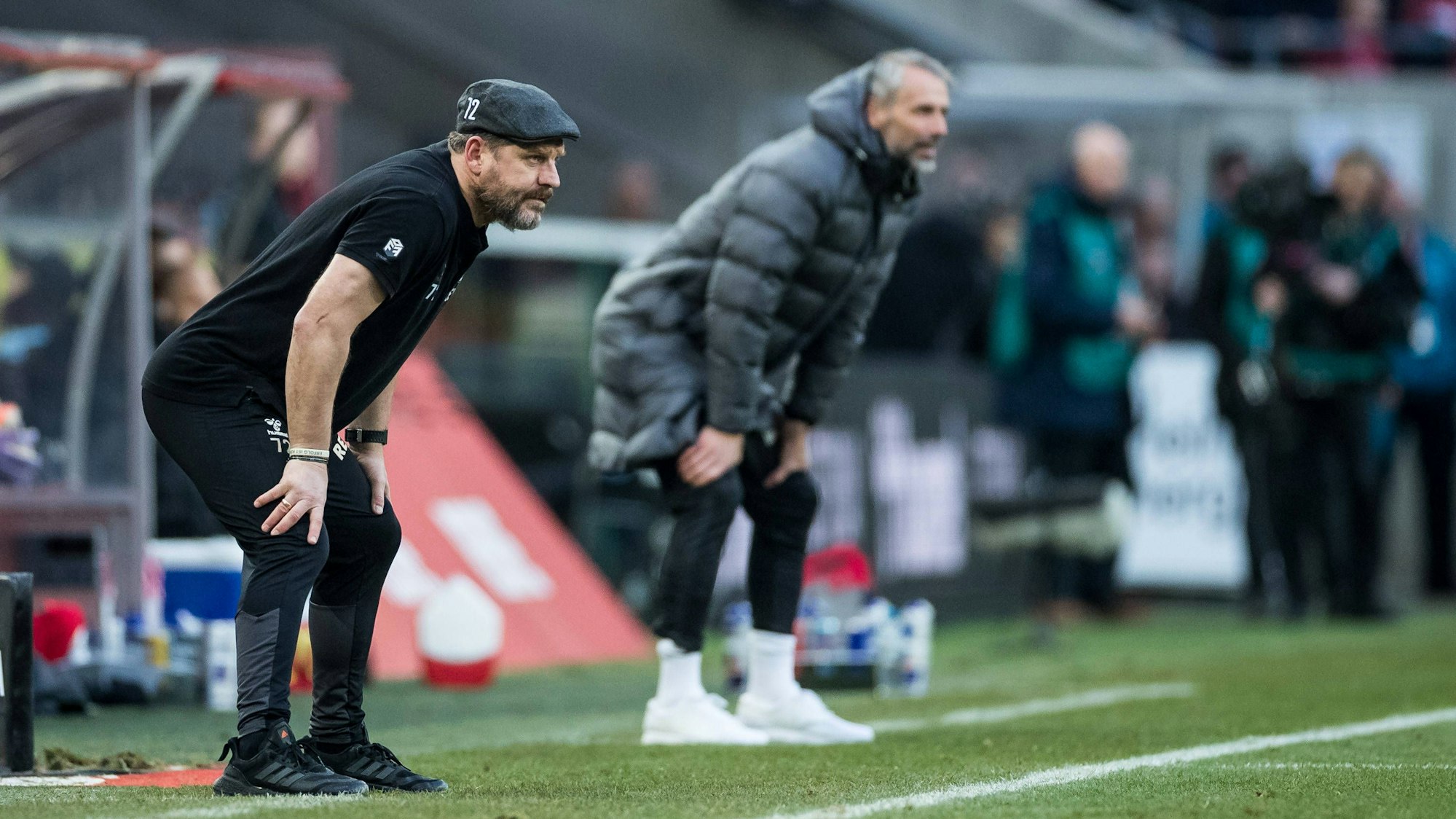Deckungsgleich an der Seitenlinie: FC-Trainer Steffen Baumgart (l.) und RB-Coach Marco Rose.