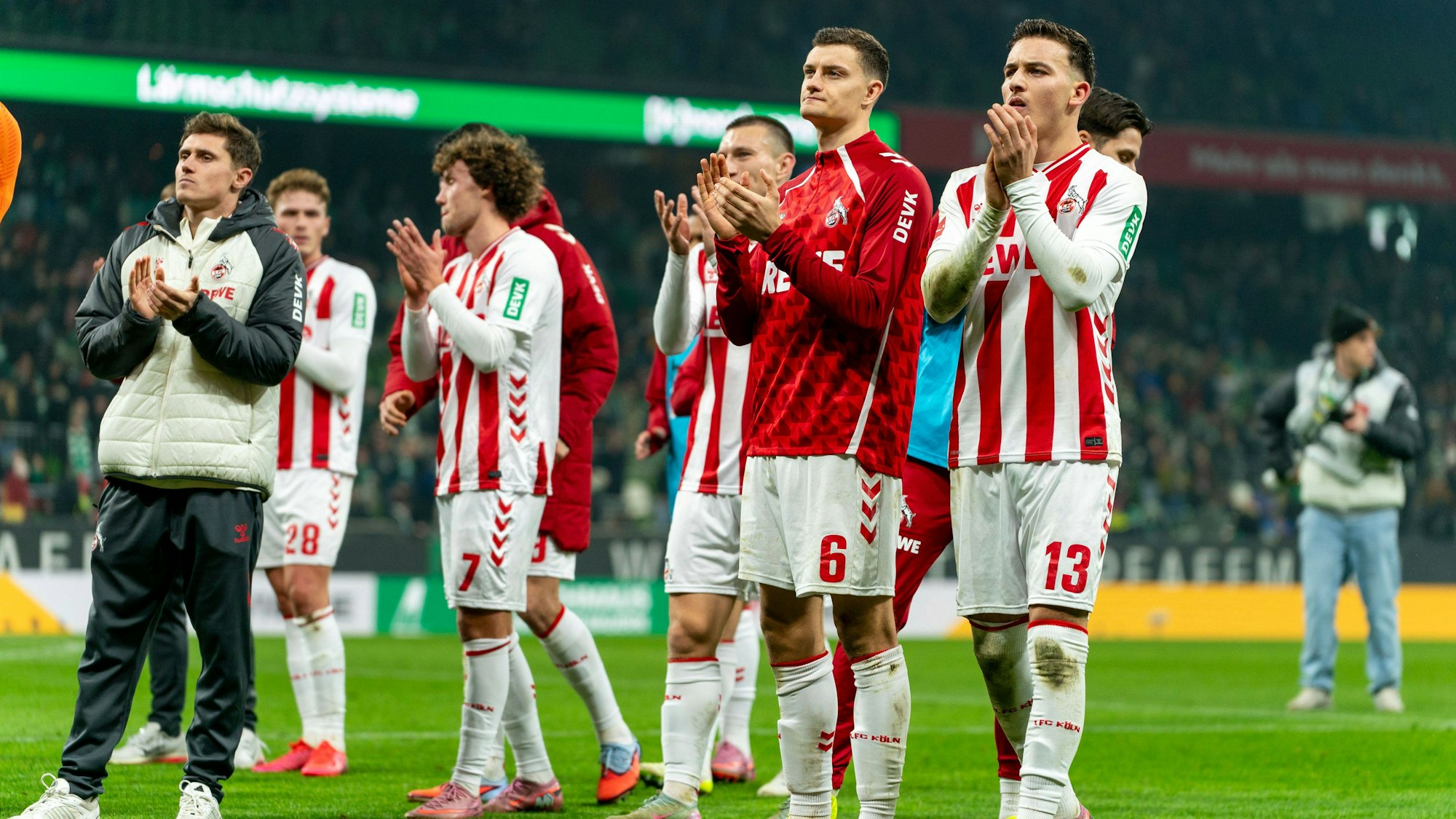Die Kölner Mannschaft bedankt sich nach Spielende bei ihren 4500 mitgereisten Fans.