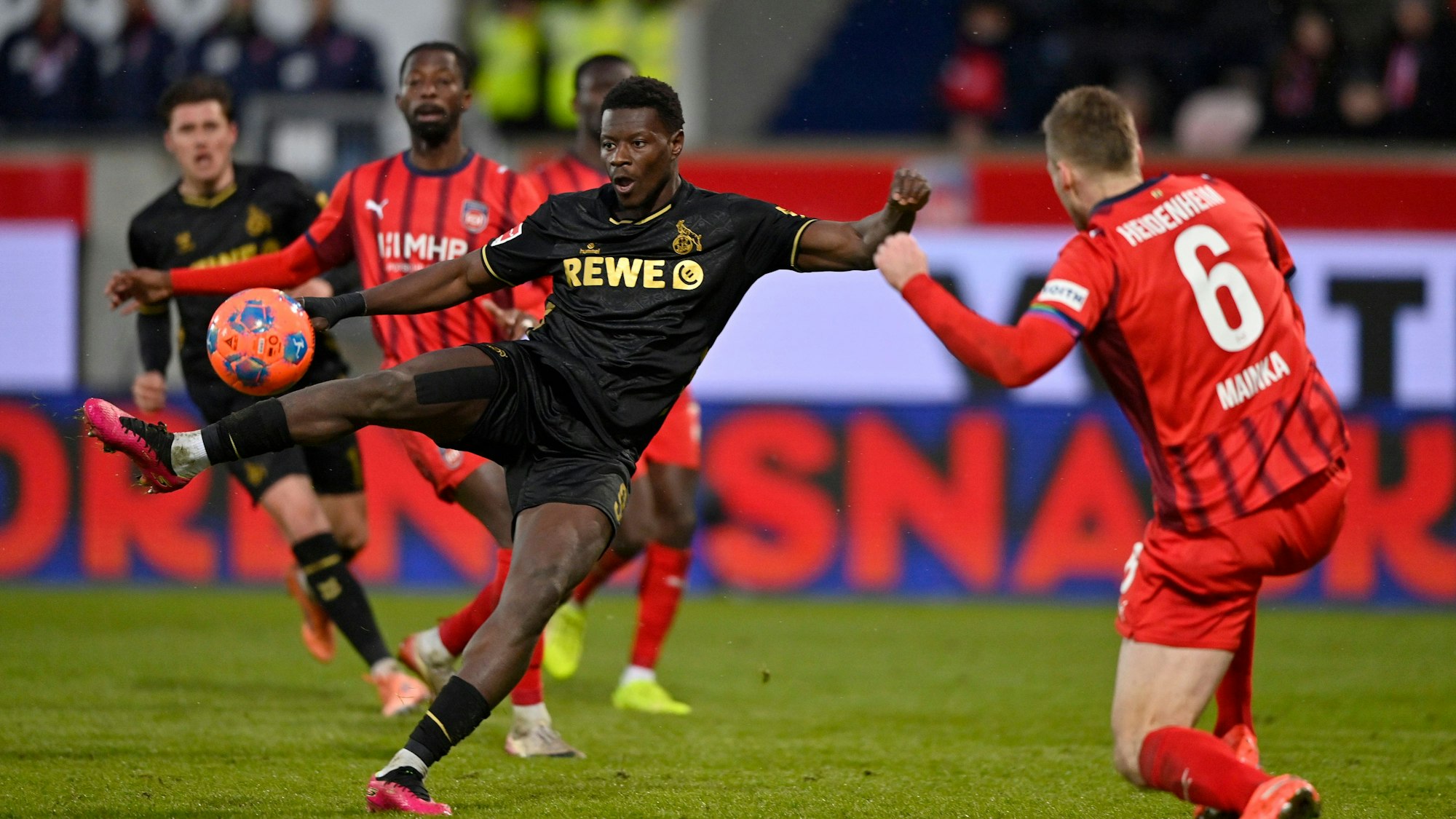In der Folge verloren die Kölner den Zugriff und konnten sich glücklich schätzen, vor der Pause nicht sogar noch ein drittes Tor kassiert zu haben. Marvin Schwäbe rettete gegen den frei stehenden Arijon Ibrahimovic zur Ecke (31.), dann rutschte Sirlord Conteh bei einem der gefährlichen Heidenheimer Umschaltaktionen am Ball vorbei (36.). In der Nachspielzeit der ersten Halbzeit wäre dem FC aus dem Nichts fast der Ausgleich gelungen. Simpson-Pusey kam nach einem Eckball am langen Pfosten zweimal zum Abschluss, wurde aber jeweils geblockt.