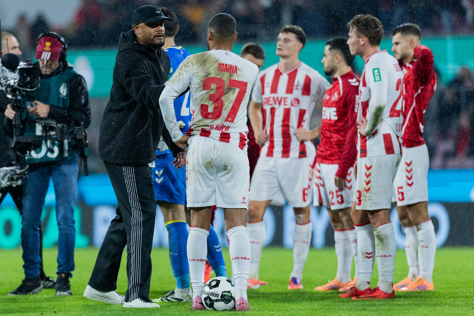 Bayern-Trainer Vincent Kompany (l.) gratuliert den Kölnern für eine selbstbewusste Vorstellung.