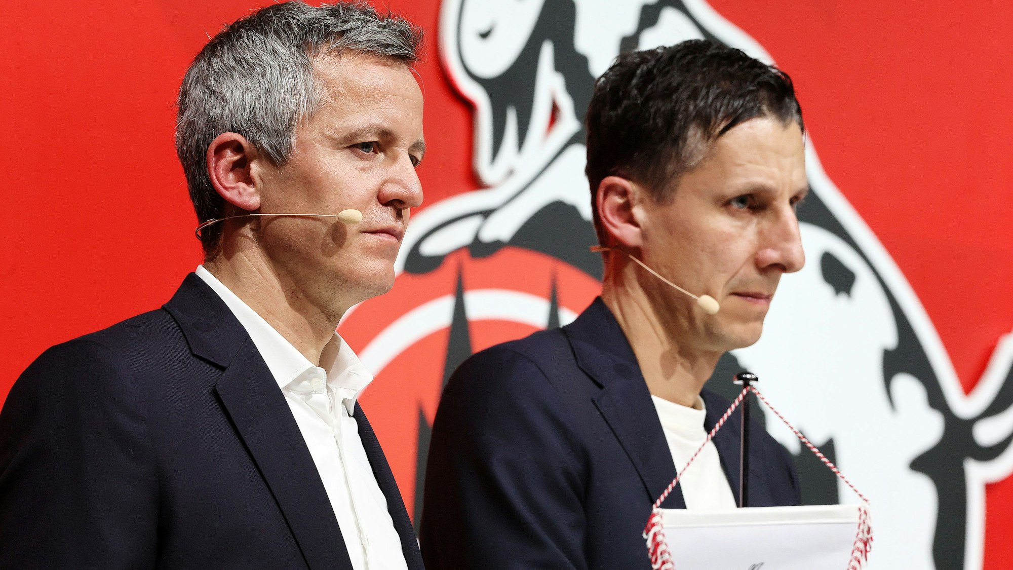 Die Geschäftsführer Philipp Türoff (l.) und Christian Keller auf dem Mitglieder-Stammtisch des 1. FC Köln im Januar.