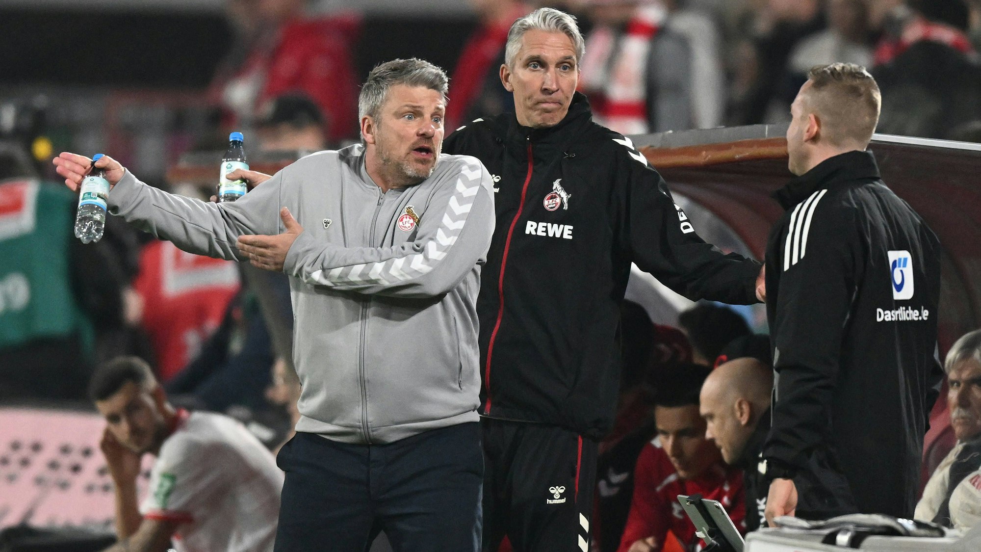 Der Verzweiflung nahe: FC-Trainer Lukas Kwasniok (l.) ärgert sich über den nicht gegebenen Handelfmeter.