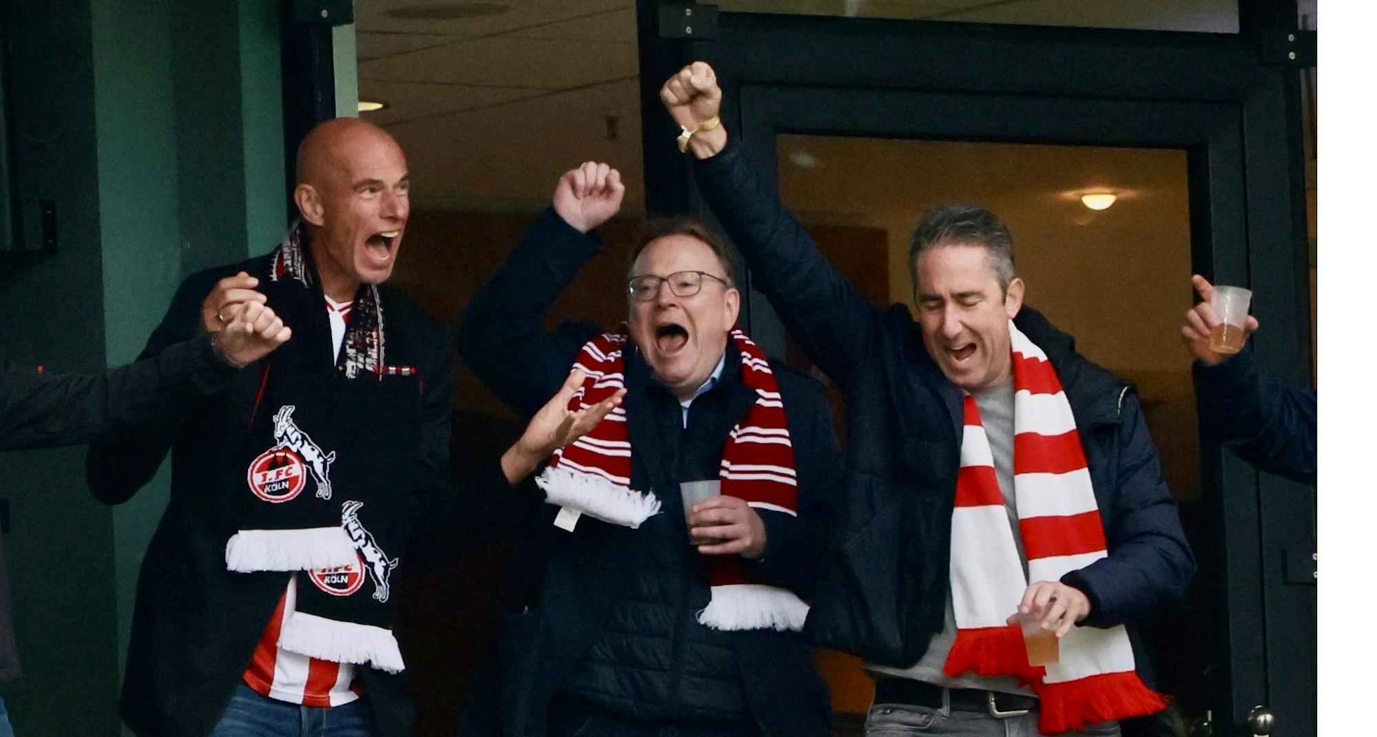 Ekstase in Müngersdorf: Kölns designierter Oberbürgermeister Torsten Burmester (M.) bejubelt mit dem neuen FC-Präsidenten Jörn Stobbe (l.) und Parteikollege Oliver Seeck den 1:1-Ausgleich gegen den FC Augsburg.