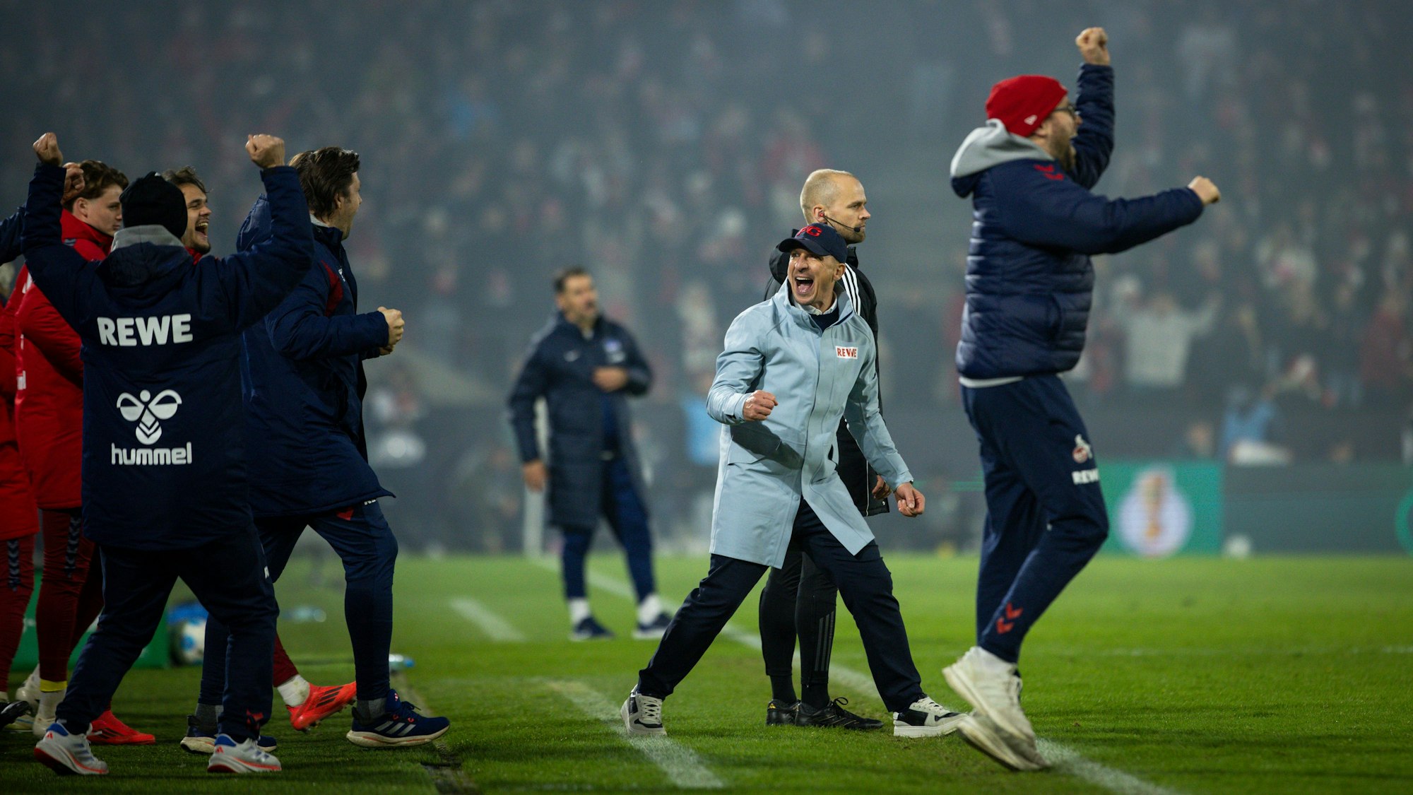 Ekstase an der Seitenlinie: Trainer Gerhard Struber (im hellblauen Mantel) bejubelt mit dem 1. FC Köln den ersten Viertelfinal-Einzug seit 2010.