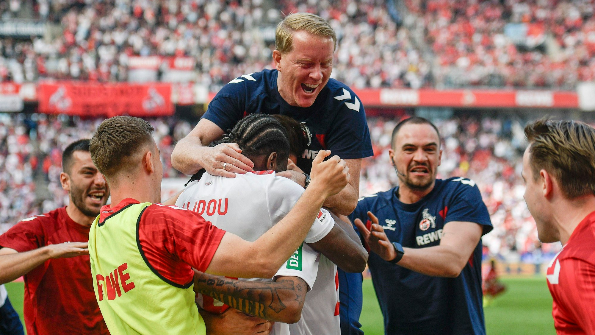 Ekstase in Müngersdorf: Spieler und Verantwortliche um Trainer Timo Schultz (oben) bejubeln das späte Siegtor des 1. FC Köln gegen Union Berlin.