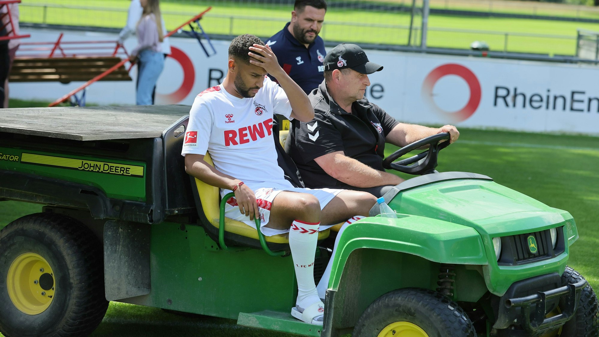 Der Rücken! Linton Maina wird vom Media Day des 1. FC Köln abtransportiert.