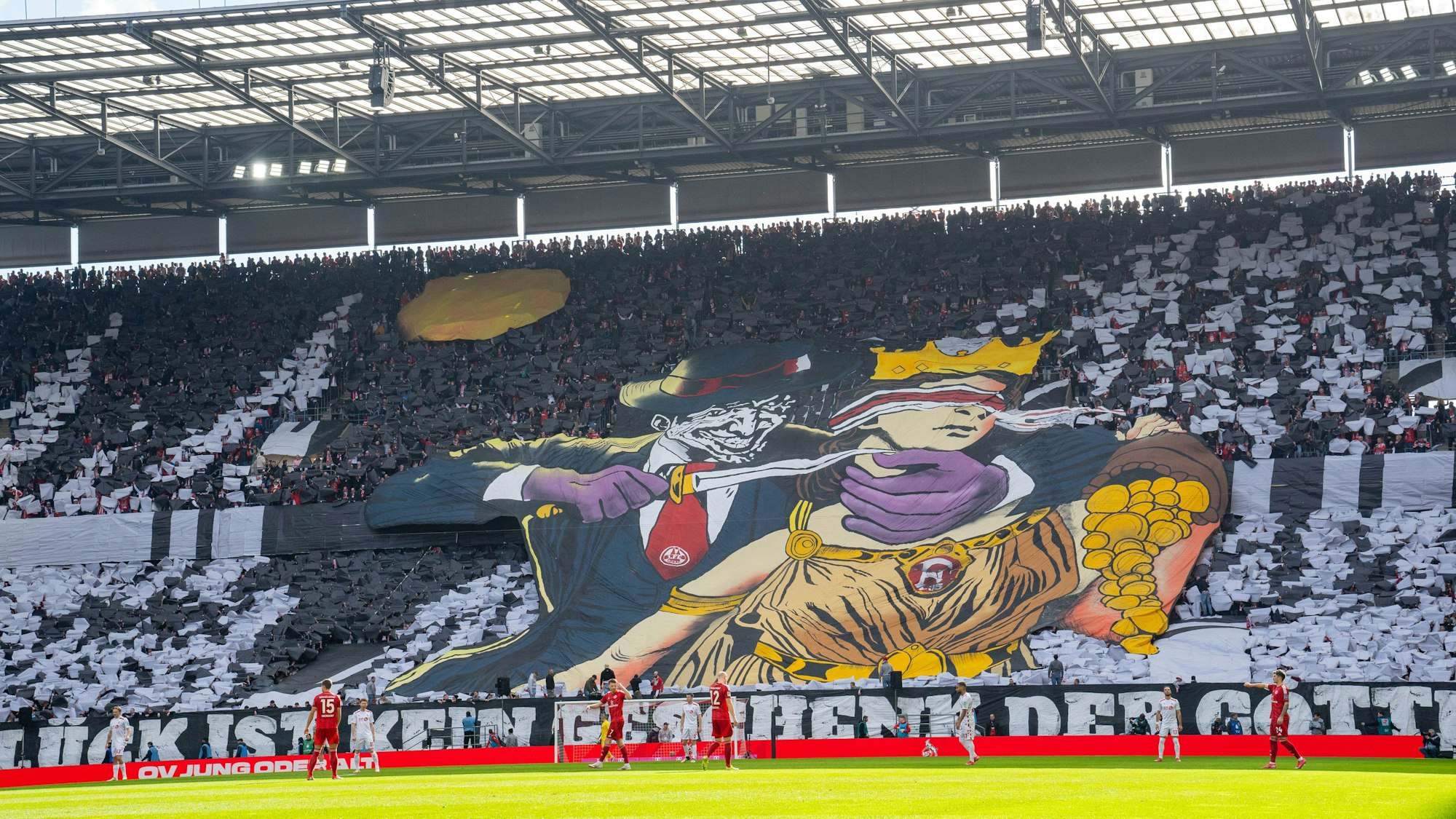 Zum Einlauf der beiden Mannschaften hatten die FC-Ultras auf der Südtribüne ein riesiges Plakat entrollt, auf dem zu sehen war, wie Glücksgöttin Fortuna ein Messer an den Hals gehalten wird. Der FC hatte die Choreographie nach internen Diskussionen letztlich genehmigt – offenbar unter der Bedingung, dass es im Gegenzug rund um das von 1000 Polizisten beschütze Risikospiel friedlich bleibt. Es sei dann auch „fast gar nichts“ passiert, mit diesen Worten rückte Geschäftsführer Christian Keller den Sicherheitsaspekt an vorderste Stelle. Gleichzeitig machte Keller mit seiner Aussage aber eine Abhängigkeit des FC von seiner aktiven Fanszene deutlich.