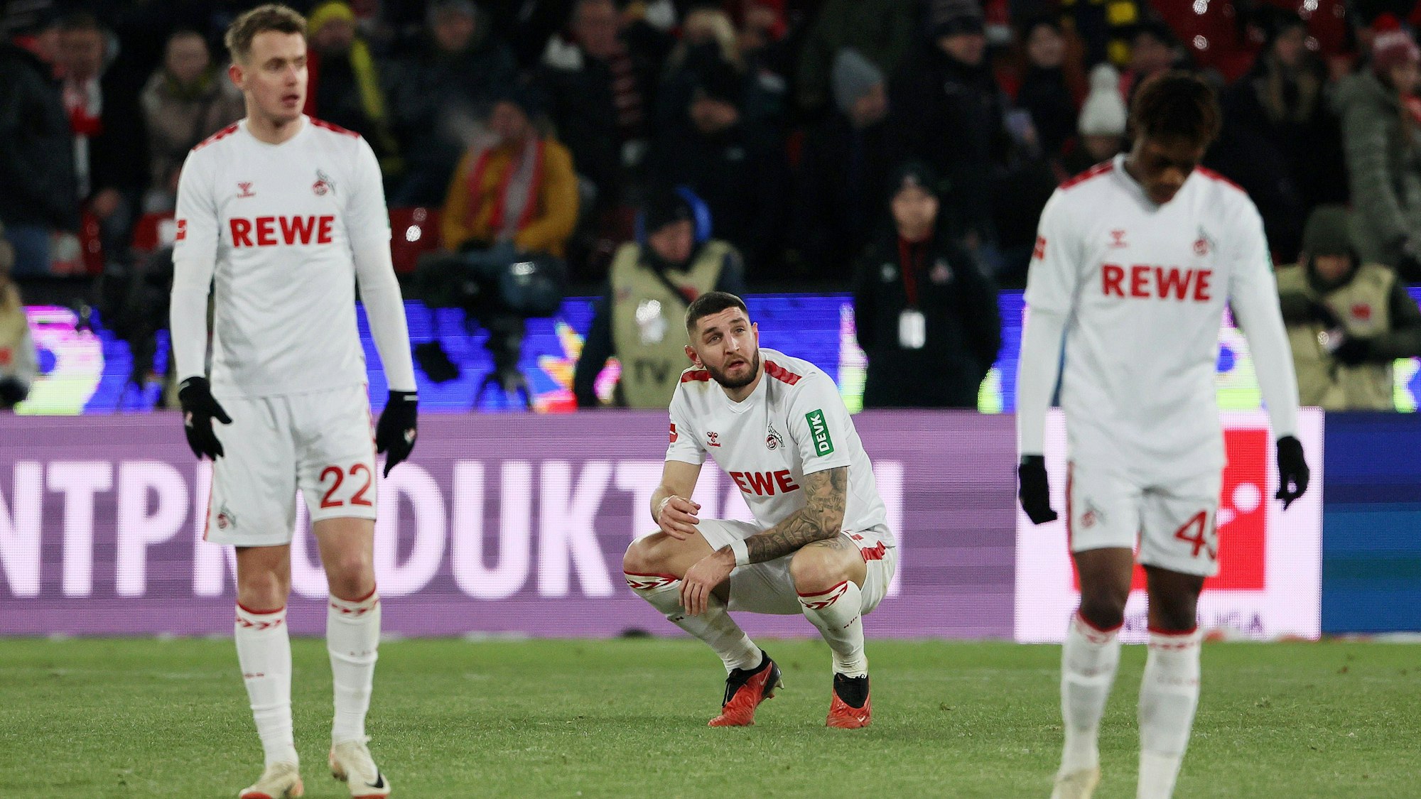 Kölner Niedergeschlagenheit: (v.l.) Bundesliga-Debütant Jacob Christensen, Jeff Chabot und Justin Diehl.