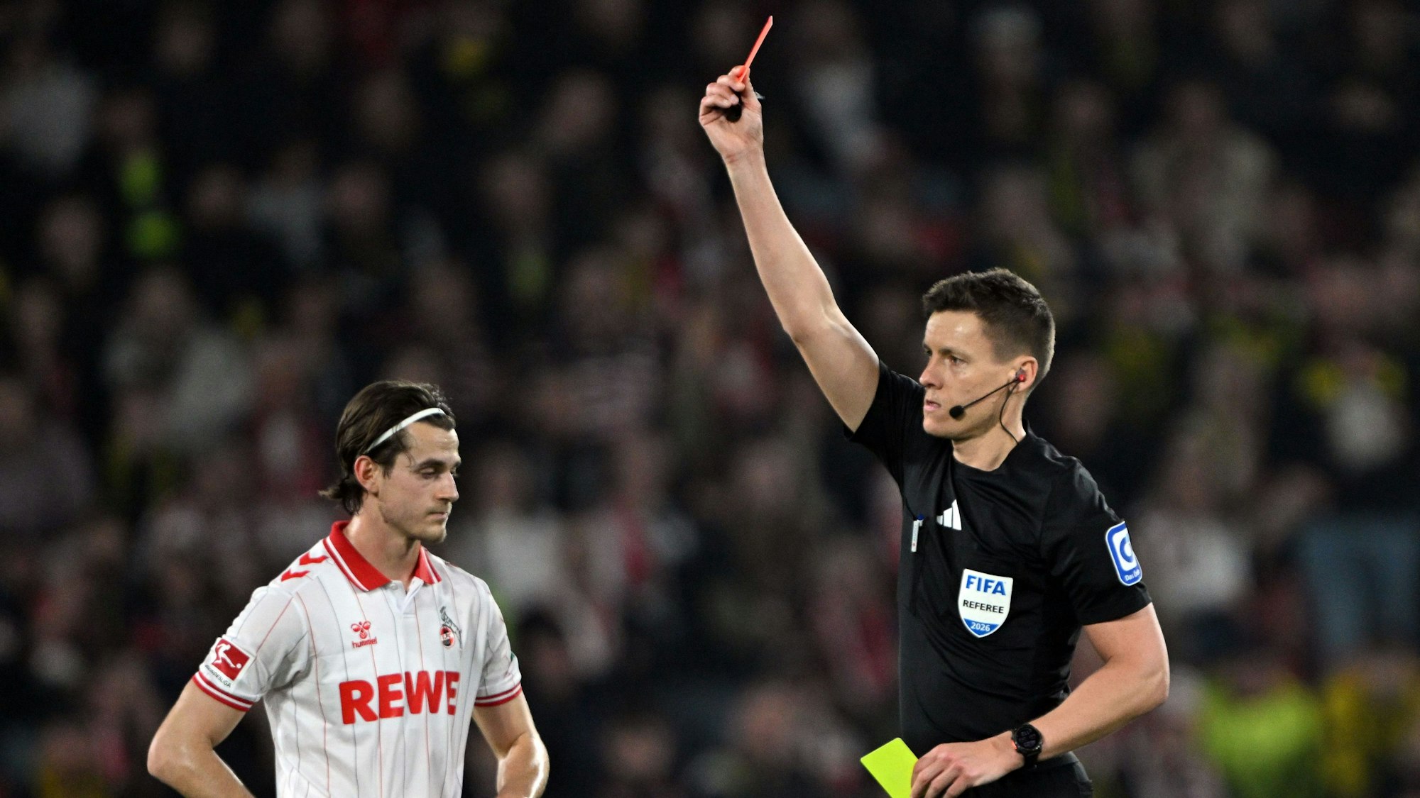 Schiedsrichter Daniel Siebert schickt den Kölner Jahmai Simpson-Pusey mit Rot vom Platz. Jakub Kaminski ist bedient.
