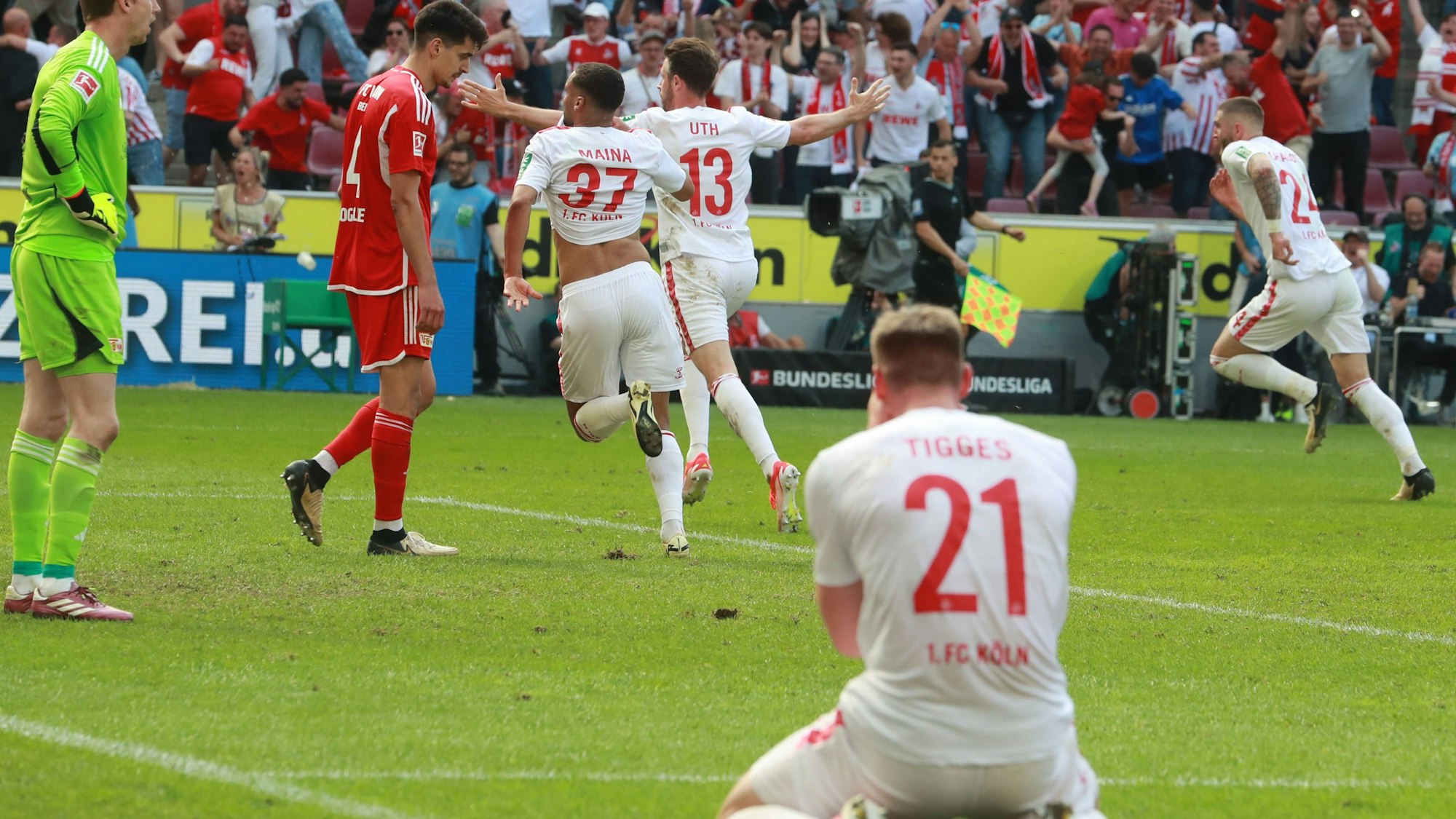 Drama in der Nachspielzeit: Steffen Tigges sinkt nach dem Siegtor zu Boden; Linton Maina, Mark Uth und Jeff Chabot drehen jubelnd ab.