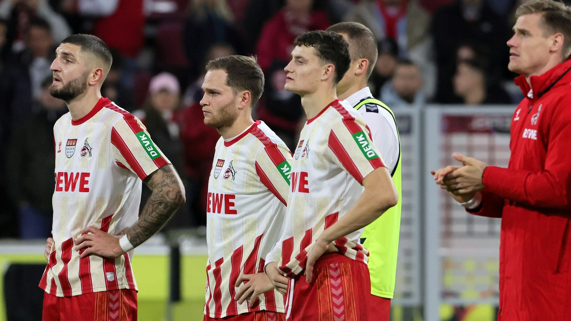In Enttäuschung vereint: Die FC-Spieler (v.l.) Jeff Chabot, Benno Schmitz, Eric Martel und Steffen Tigges nach dem Chancenwucher gegen Augsburg.
