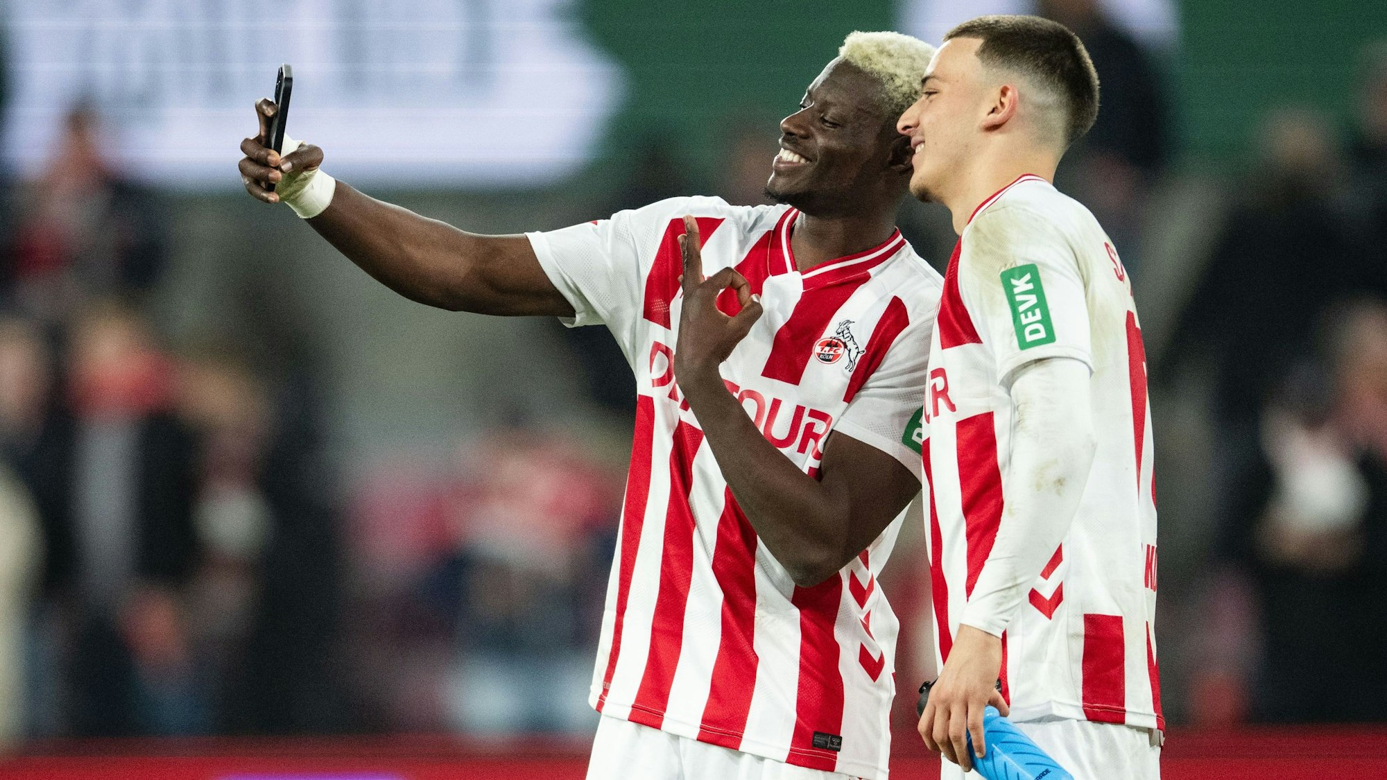 Bitte lächeln: Der Kölner Doppeltorschütze Ragnar Ache (l.) und Said El Mala stellen sich zum Siegerselfie auf.