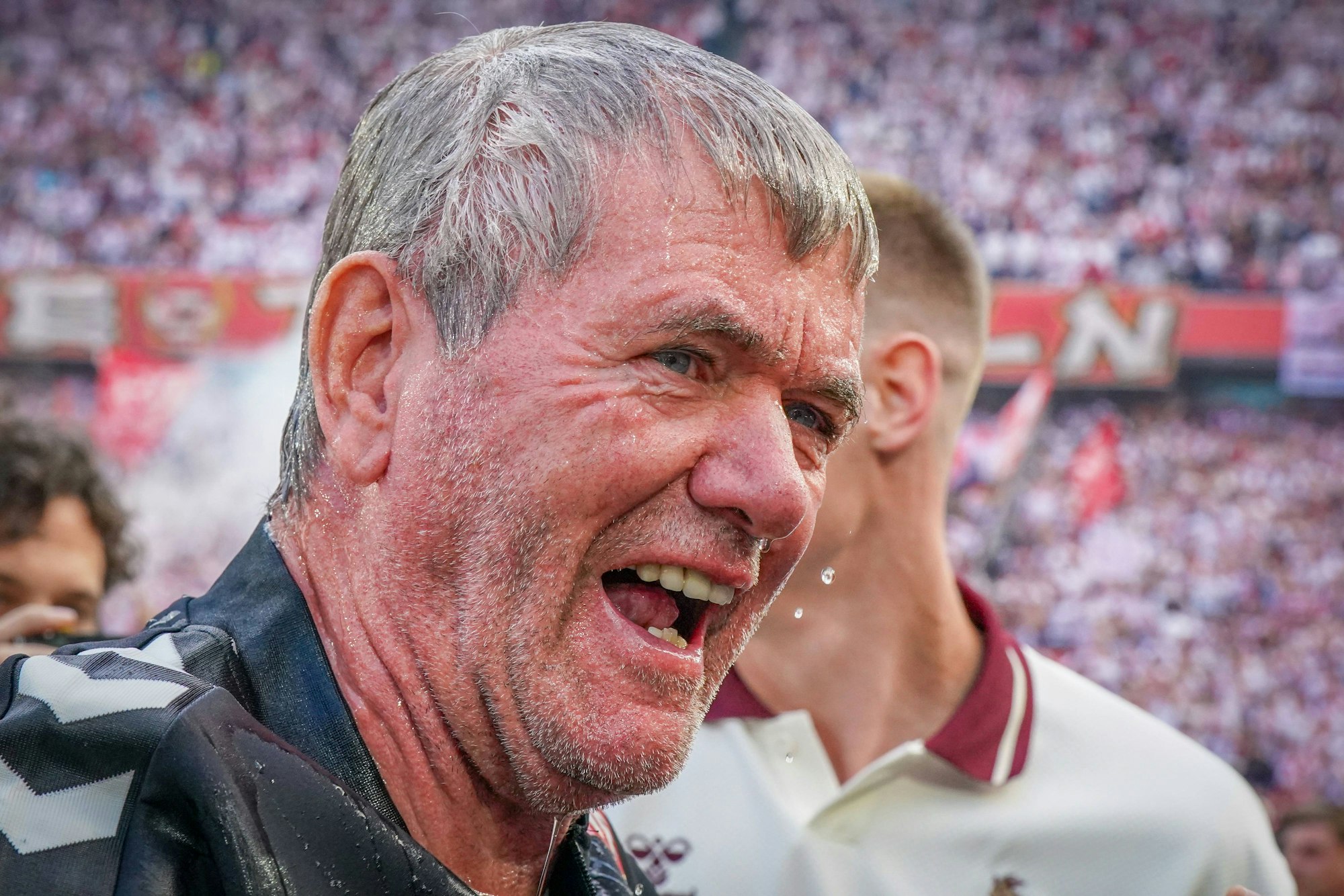Durchnässt von einer Bierdusche: FC-Trainer Friedhelm Funkel.