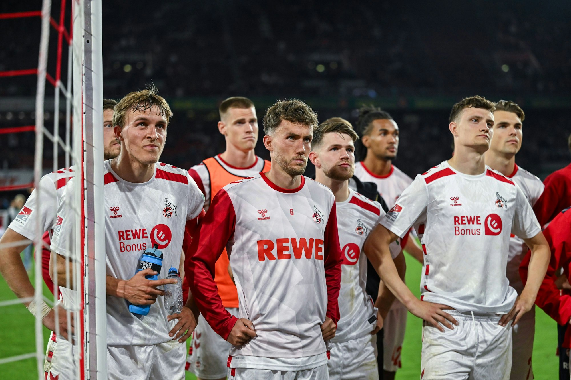 Desillusionierte Blicke: Die Mannschaft des 1. FC Köln um Kapitän Timo Hübers (l.) nach dem 1:1 gegen Regensburg.
