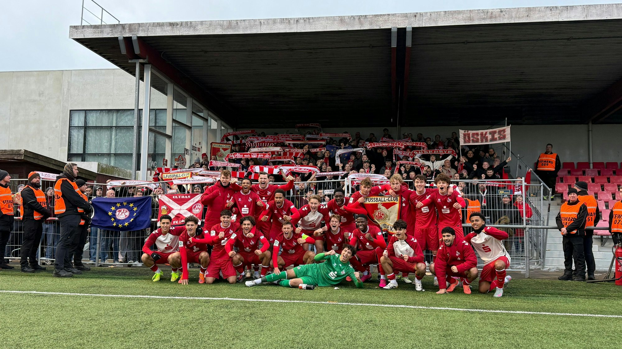 Die U19 des 1. FC Köln bejubelt nach einem 4:1-Sieg in Midtjylland den Einzug ins Sechzehntelfinale der Uefa Youth League.