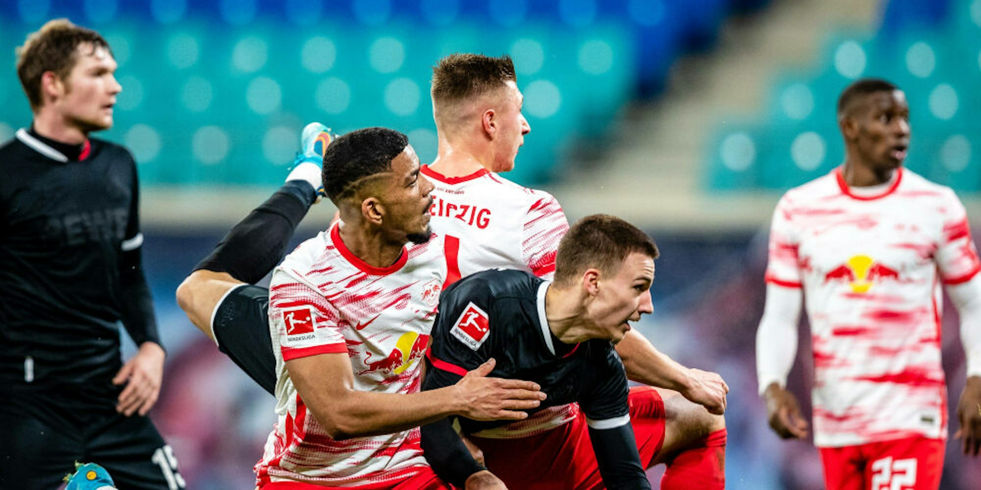 FC-Talent Tim Lemperle setzt sich bei seinem Tor gegen die Leipziger Benjamin Henrichs (l.) und Willi Orban durch.