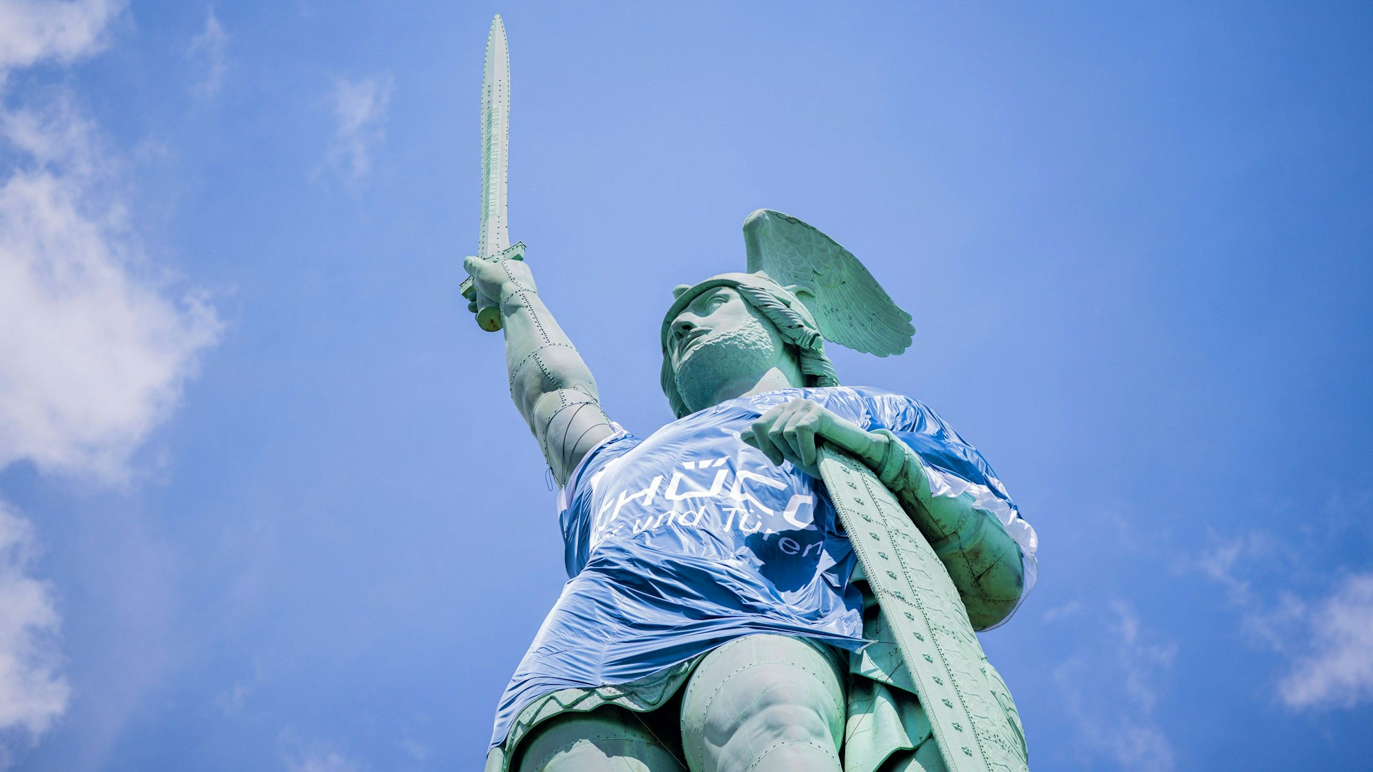 Das Hermannsdenkmal mit dem Trikot von Sensations-Pokalfinalist Arminia Bielefeld.