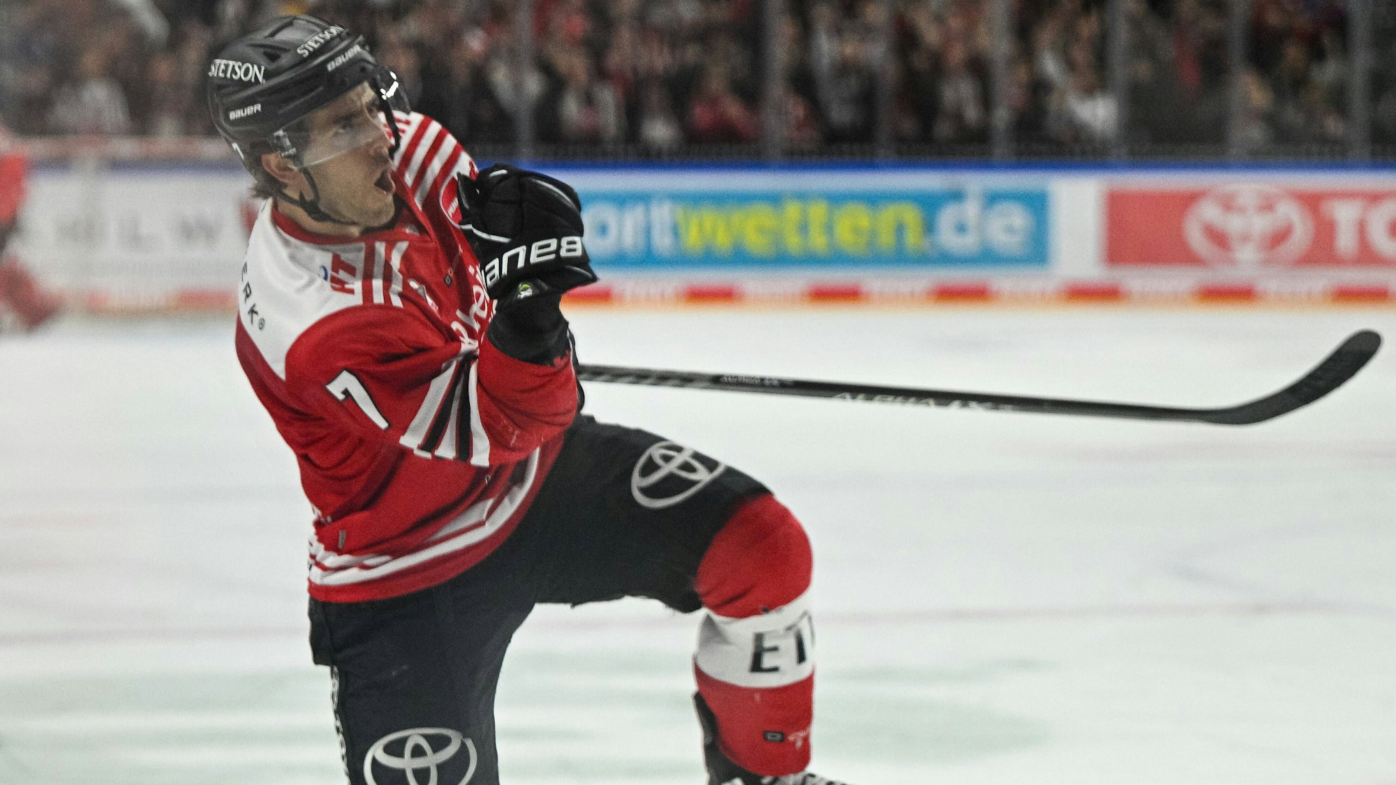 Die pure Freude: Der Kölner Starverteidiger Nick Bailen bejubelt seinen späten Siegtreffer zum 2:1 gegen Straubing.