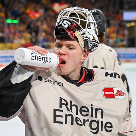 - Kölner Haie Janne Juvonen hält den Sieg fest