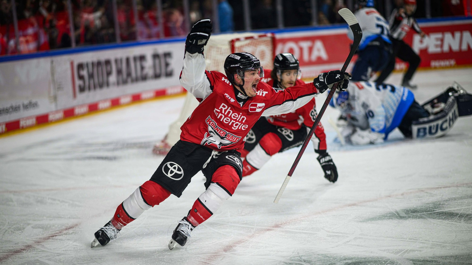 Justin Schütz platzte vor Stolz. Nicht etwa, weil er darauf angesprochen wurde, dass nach zwölf Spielen nun auch bei ihm so etwas wie ein Playoff-Bart zu erkennen war, sondern weil sich sein Knoten genau im richtigen Moment gelöst hatte. 69:04 Minuten waren gespielt, als der Stürmer der Kölner Haie das sechste Halbfinalspiel gegen den ERC Ingolstadt mit seinem ersten Playoff-Treffer dieser Saison zum 3:2 (1:2, 0:0, 1:0, 1:0) nach Verlängerung beendete und den Startschuss für eine ohrenbetäubende Party in der mit 18.600 Zuschauern ausverkauften Lanxess-Arena gab.
