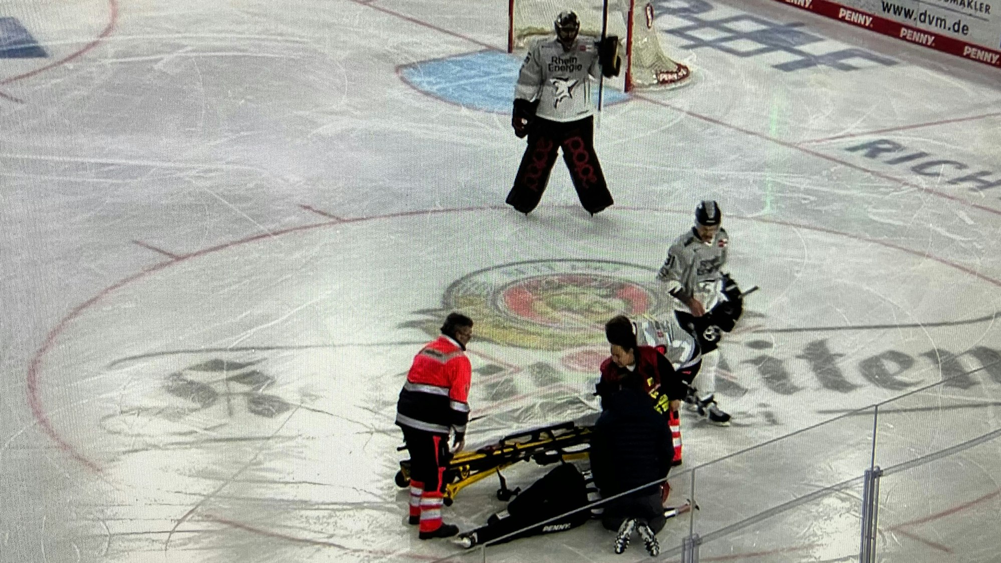 Schiedsrichter Martin Frano musste beim Spiel der Kölner Haie in Straubing nach wenigen Sekunden verletzt vom Eis gebracht werden.