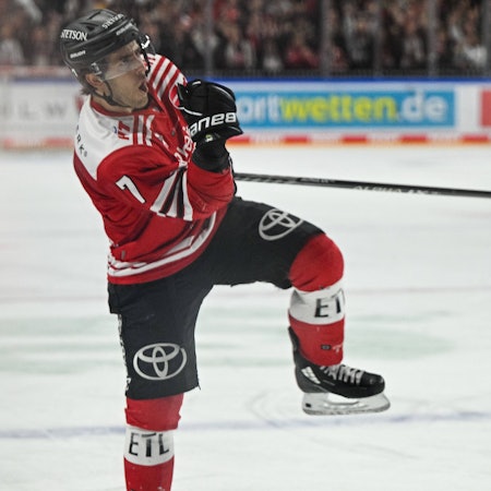 - Kölner Haie Janne Juvonen hält den Sieg fest