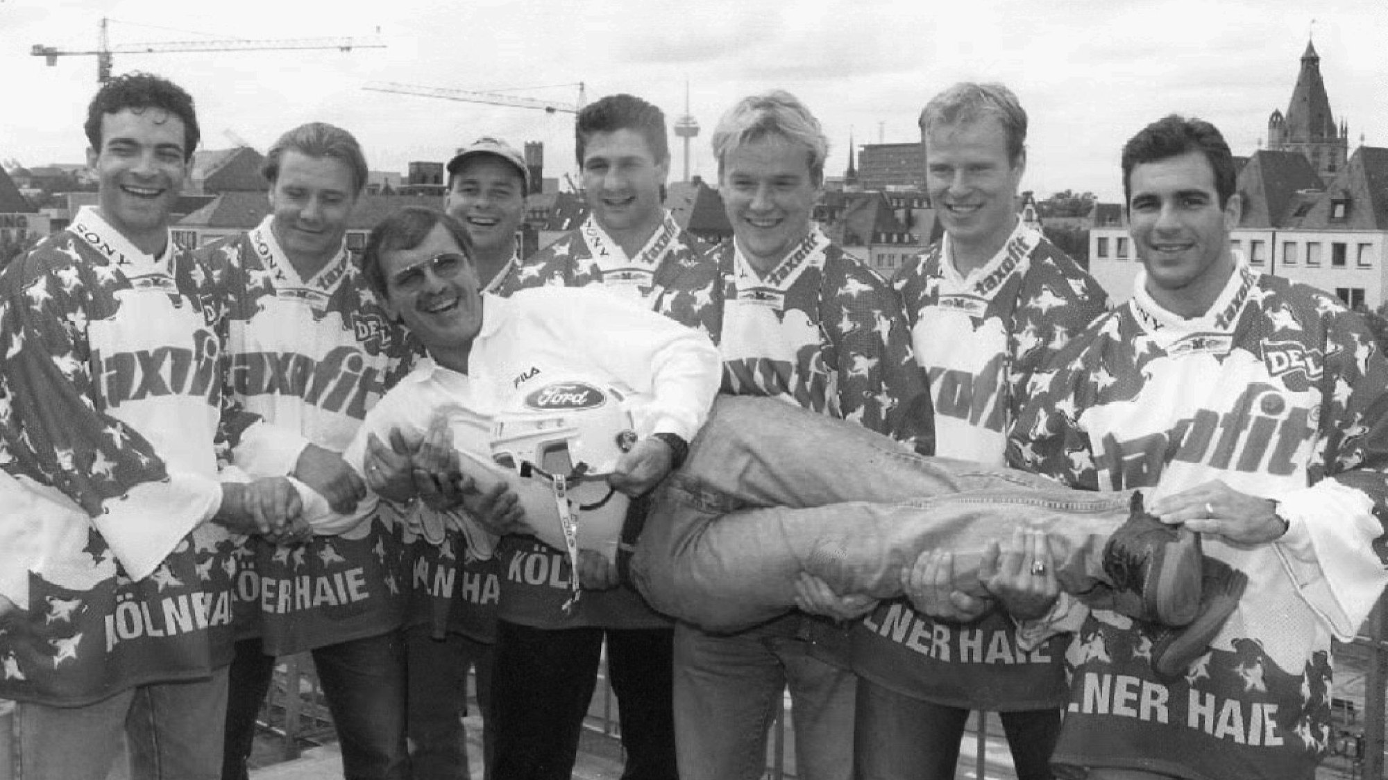 Trainer Bob Murdoch lässt sich vor der Saison 1996/97 von den Neuzugängen der Kölner Haie hochleben.
