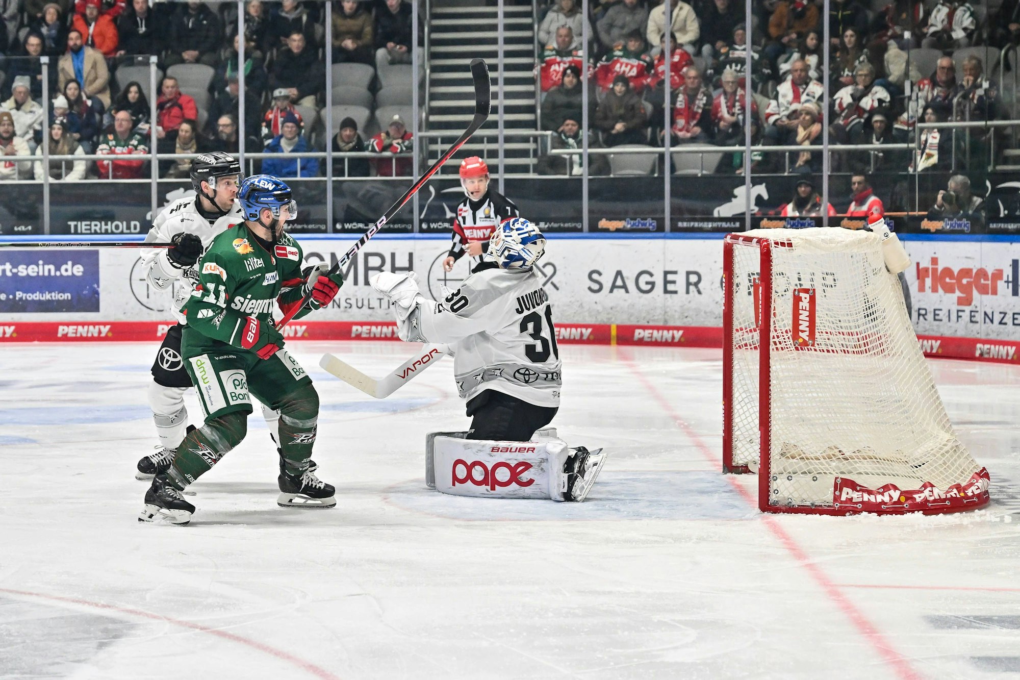 Von Beginn an entwickelte sich eine Begegnung mit vielen Möglichkeiten auf beiden Seiten. Sowohl Juvonen als auch sein Gegenüber Michael Garteig konnten sich auszeichnen. Moritz Elias hatte die größte Chance für die Gastgeber, scheiterte aber frei stehend am finnischen Schlussmann. So war die Führung des AEV in der zehnten Minute nicht unverdient. Christian Hanke gelang das 1:0. Der Stürmer profitierte davon, dass Veli-Matti Vittasmäki seinen Schuss unhaltbar abfälschte. Für die Haie war der Rückstand eine Art Initialzündung, noch mehr Druck auf das Augsburger Tor auszuüben. Mit Erfolg: Maximilian Kammerer markierte mit einem präzisen Schuss unter die Latte den Ausgleich (18.). Es war bereits das neunte Tor des Kölner Angreifers in den vergangenen acht Spielen.