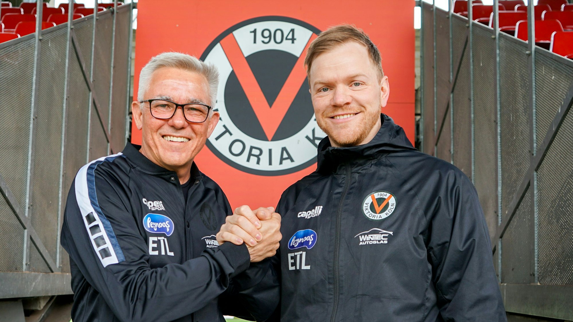Olaf Janßen (l.) übergibt bei Viktoria Köln den Trainerposten an Marian Wilhelm (r.)
