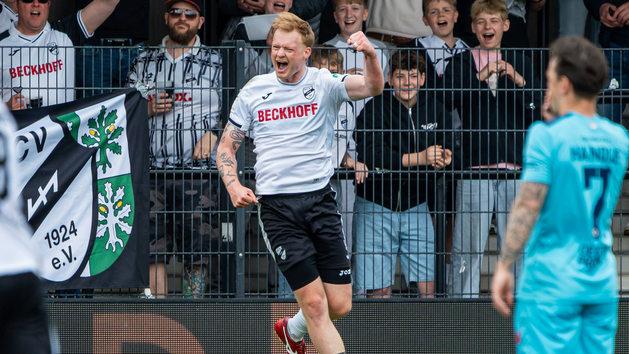 Verls Torjäger Jonas Arweiler bejubelt seinen Doppelpack, der Kölner Simon Handle schaut staunend zu.