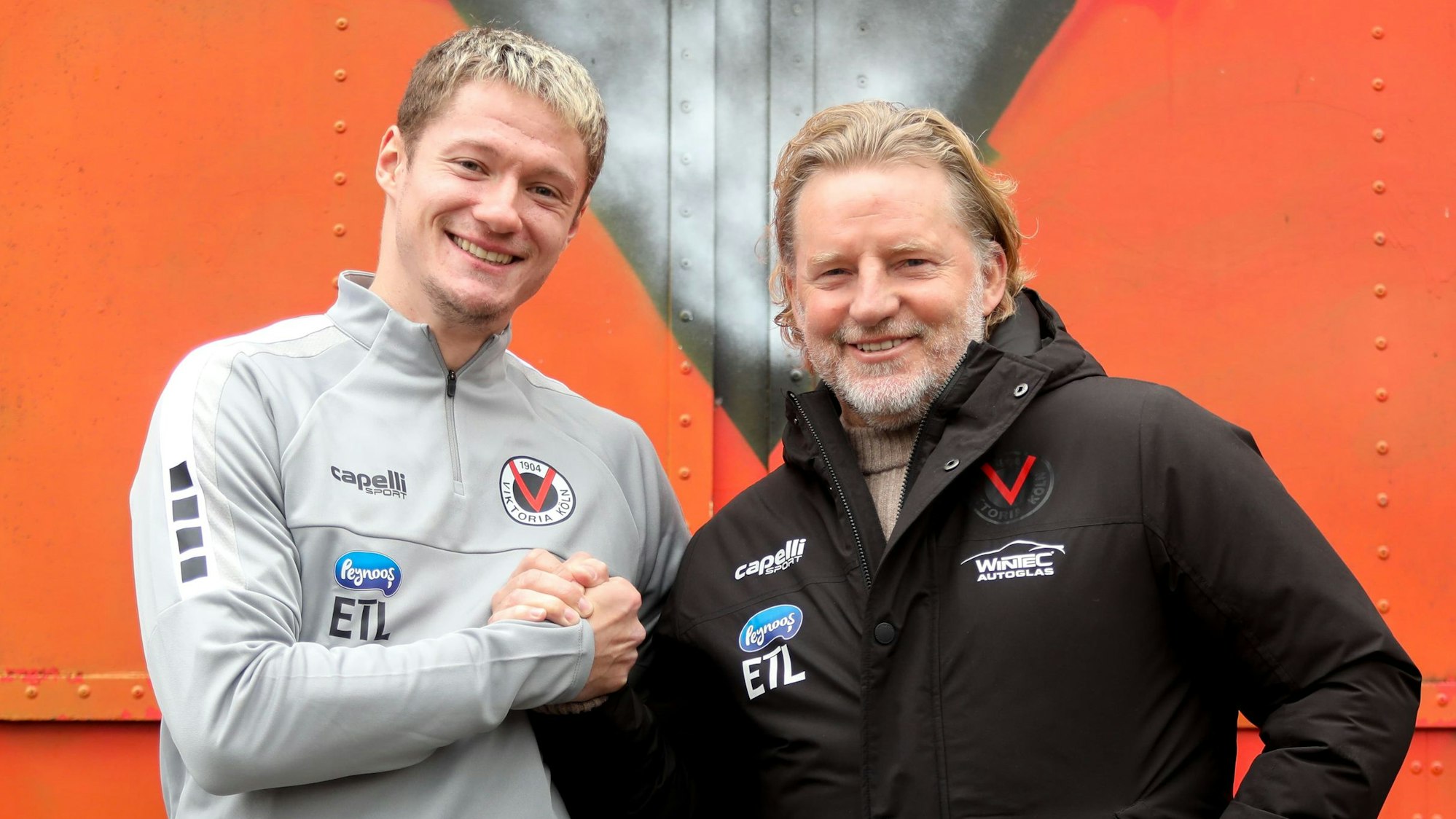Viktoria-Neuzugang Tobias Eisenhuth (l.) mit Kölns Sportlichem Leiter Stephan Küsters