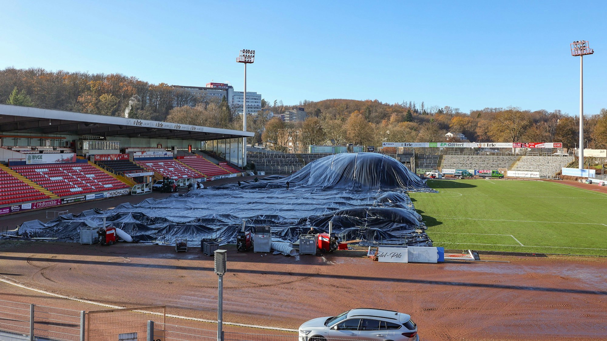Heizungsstrahler und eine Folie, unter der die warme Luft gespeichert wird, im Leimbachstadion. Am Ende konnte das Spiel gegen Fortuna Köln stattfinden.
