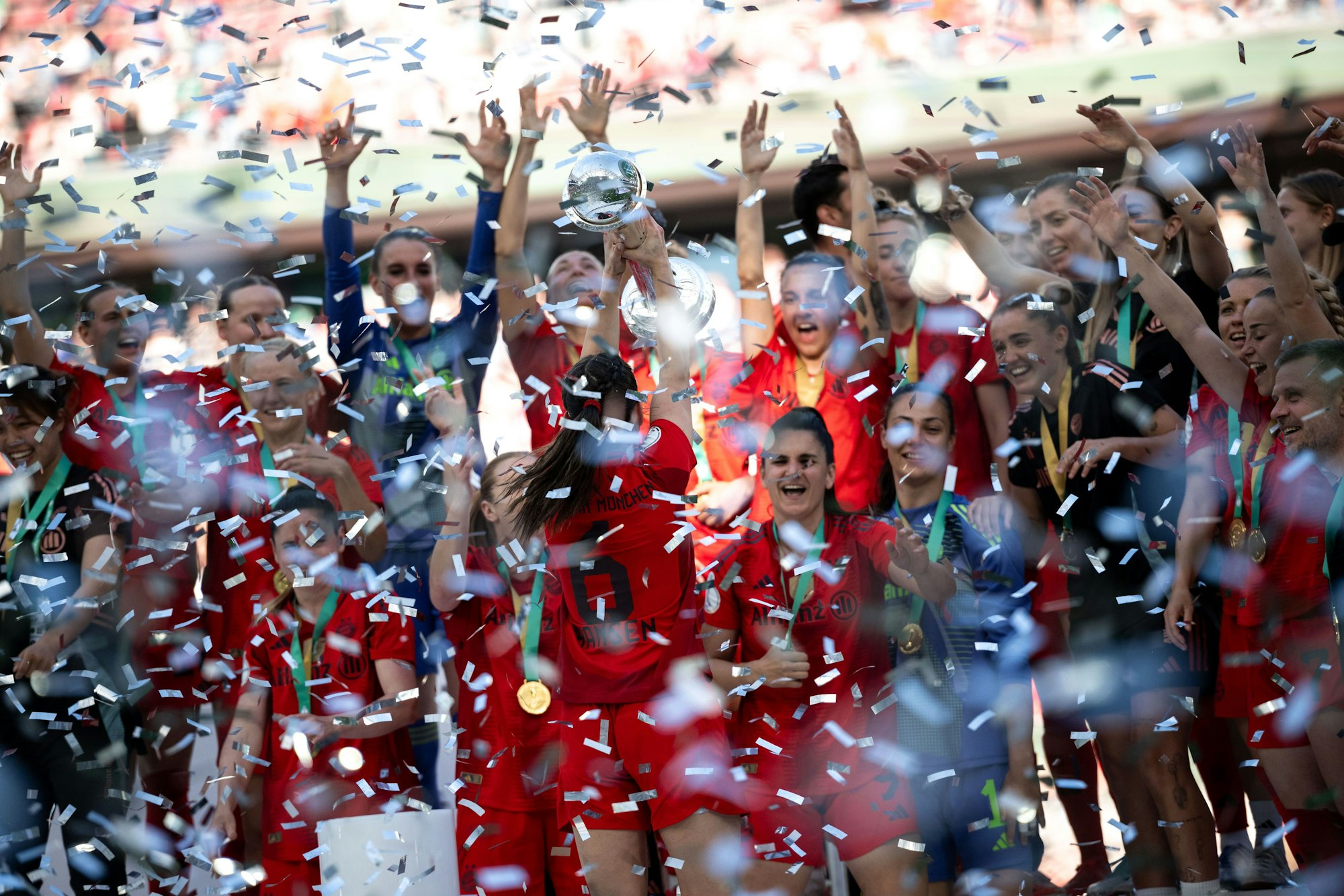 Jubel im Konfettiregen von Müngersdorf: Die Frauen des FC Bayern holen zum ersten Mal das Double.