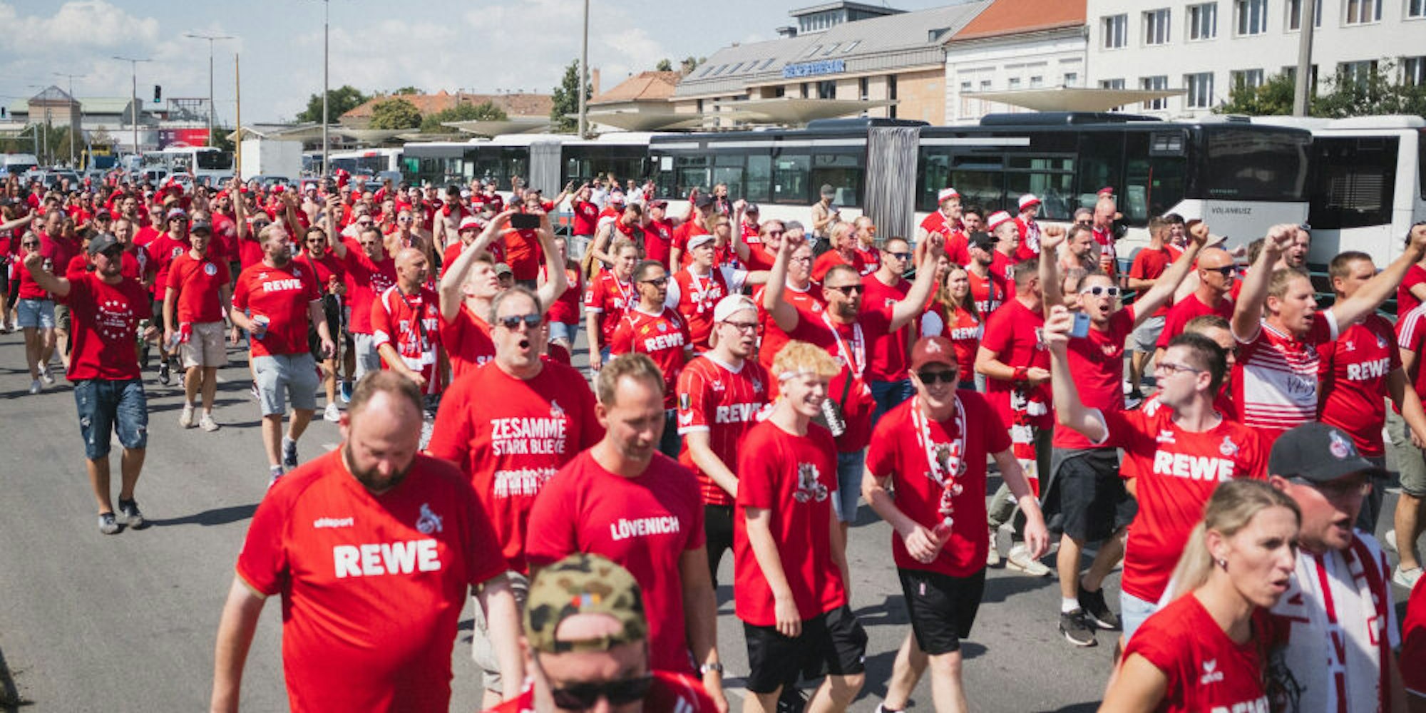 Székesfehérvár – Krawalle? Bis auf ein paar kleinere Scharmützel zwischen ungarischen Hooligans und Anhängern des 1. FC Köln – Fehlanzeige. Probleme bei der Ticketausgabe? Keine. Die befürchtenden Fan-Probleme vor dem Playoff-Rückspiel der Conference League zwischen Fehérvár FC und dem 1. FC Köln sind ausgeblieben. Die rund 3000 Kölner Fans feierten bei Temperaturen um die 30 Grad Celsius in der Innenstadt von Szekésfehérvár in ihren roten Europa-Shirts ein weitgehend friedliches Fest.