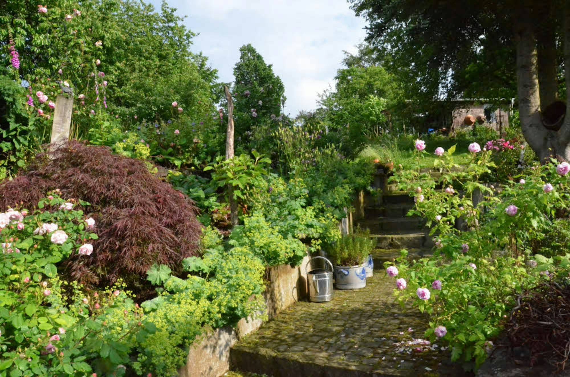 Mit Bergischer Grauwacke gestaltet sind derweil die Terrassen und ein schmaler Bachlauf im Garten von Ela und Dennis Thiele in Reichshof-Hasenbach. „Wir wollen zeigen, dass auf kleinem Raum viel Garten möglich ist“, erklärt Dennis Thiele seine „Blühenden Visionen“. Viele Lieblingsplätze in ihrem „Garten zum Rosenbogen“ hat Gabi Dehler in Reichshof-Eiershagen. „Am Ende geht es aber doch nur um Wohlfühlen“, findet sie.