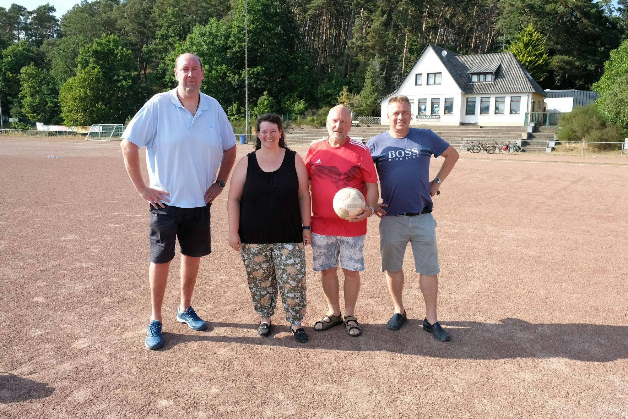 Vereinschef Peter Schweikert-Wehner, Platzwart Rolf Dreesen, Betreuerin Katja Bartsch und Edelfan Mario Fuß (v.r.) im Eifelstadion.