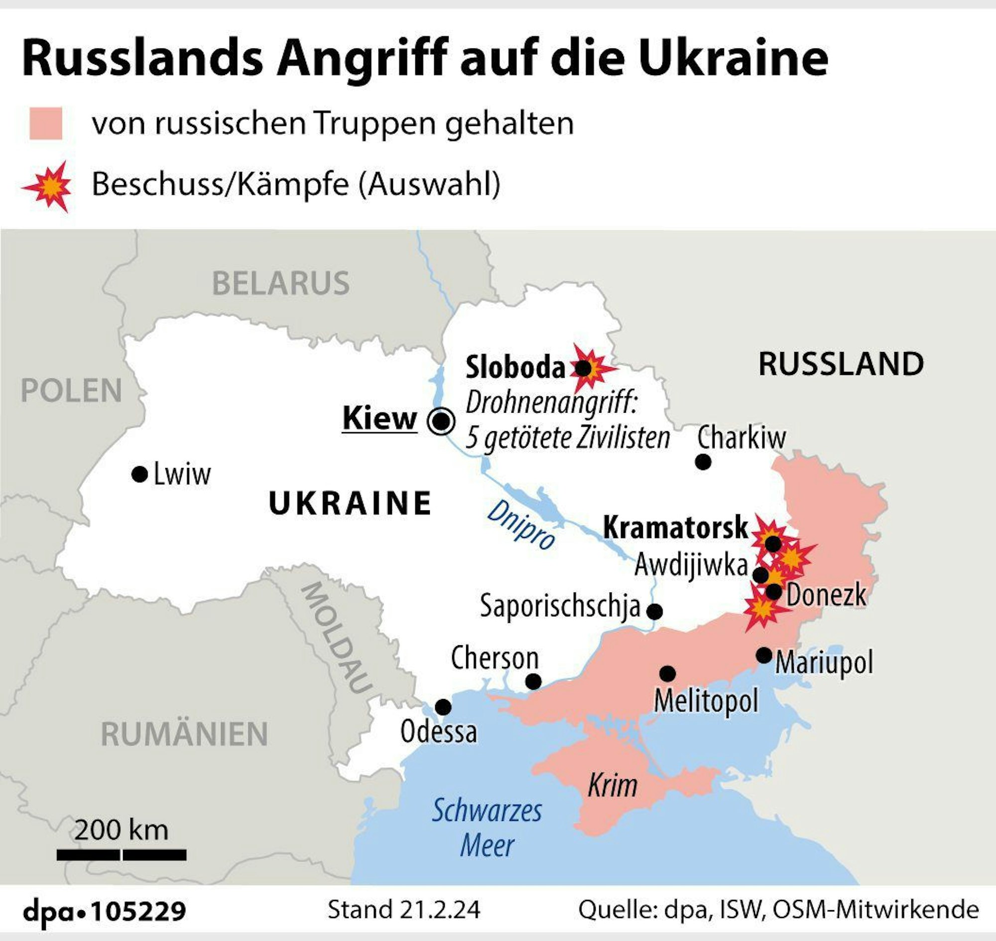 Dennoch spricht derzeit viel dafür, dass Russland die Oberhand an der Front gewonnen hat. Am Montag hatte die ukrainische Armee einen Rückzug auf neue Verteidigungspositionen westlich der erst kürzlich von Russland eroberten Industriestadt Awdijiwka eingeräumt. Dem Sprecher der Gruppierung im Südosten, Dmytro Lychowij, zufolge solle die neue Verteidigungslinie nun entlang der Dörfer Berdytschi, Orliwka und Tonenke verlaufen. (mit dpa)