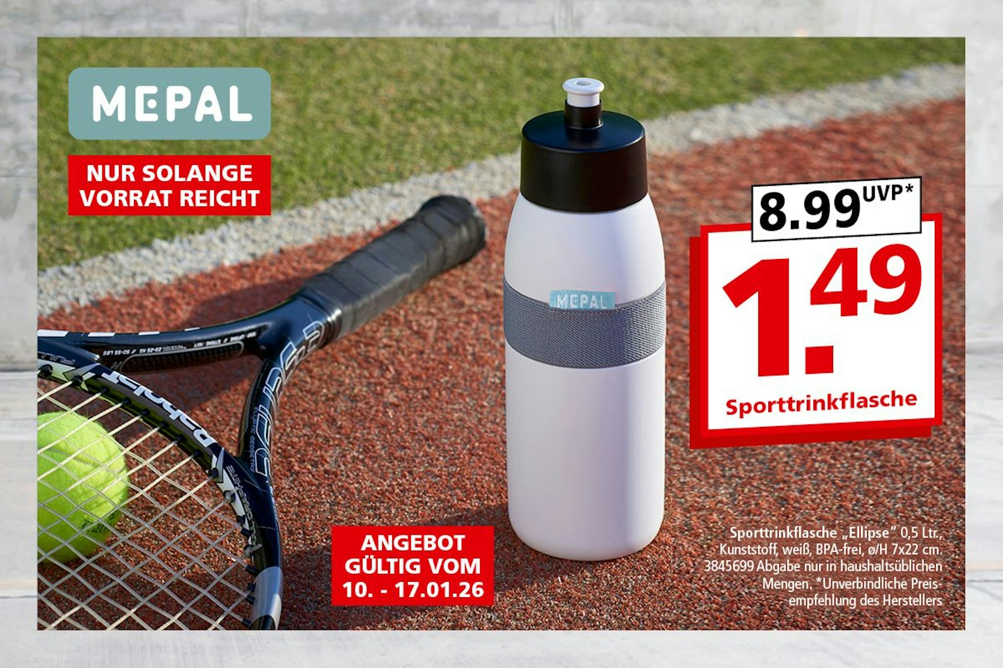 Anlässlich des Fitnesstages wartet ein besonderes Angebot auf alle Besucher: Die Sporttrinkflasche „Ellipse“ der Firma Mepal gibt es im Einrichtungshaus zum unschlagbaren Preis von 1,49 Euro.