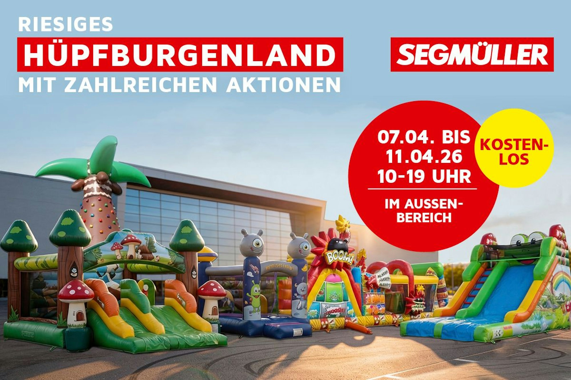 Von Dienstag, 7., bis Samstag, 11. April 2026, erwartet die ganze Familie ein einzigartiges Shoppingerlebnis bei SEGMÜLLER. Ein Besuch im riesigen Hüpfburgenland auf dem Außengelände des Einrichtungshauses ist die Attraktion für alle jungen Gäste und rundet den Einkaufsbummel im Möbelhaus perfekt ab.