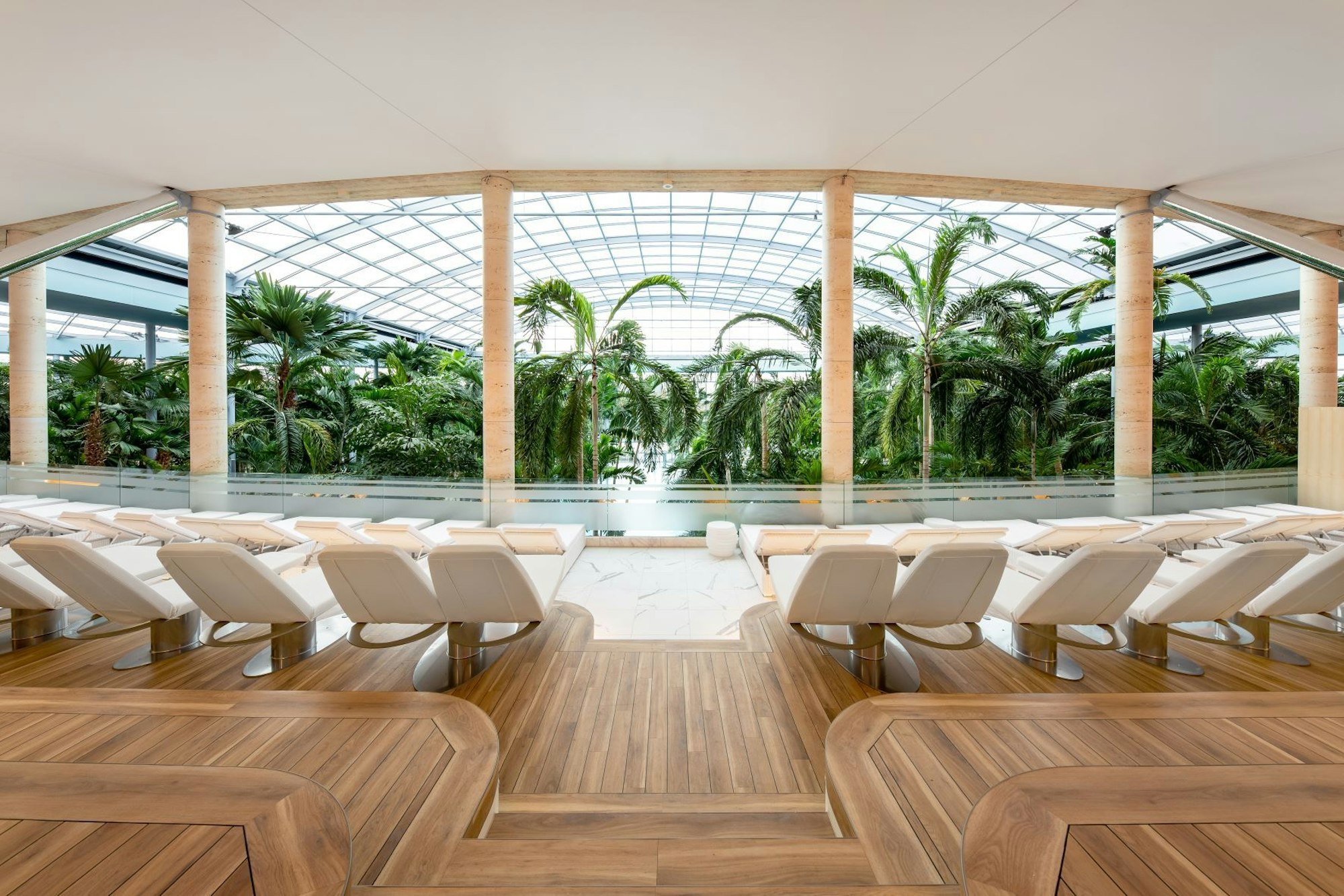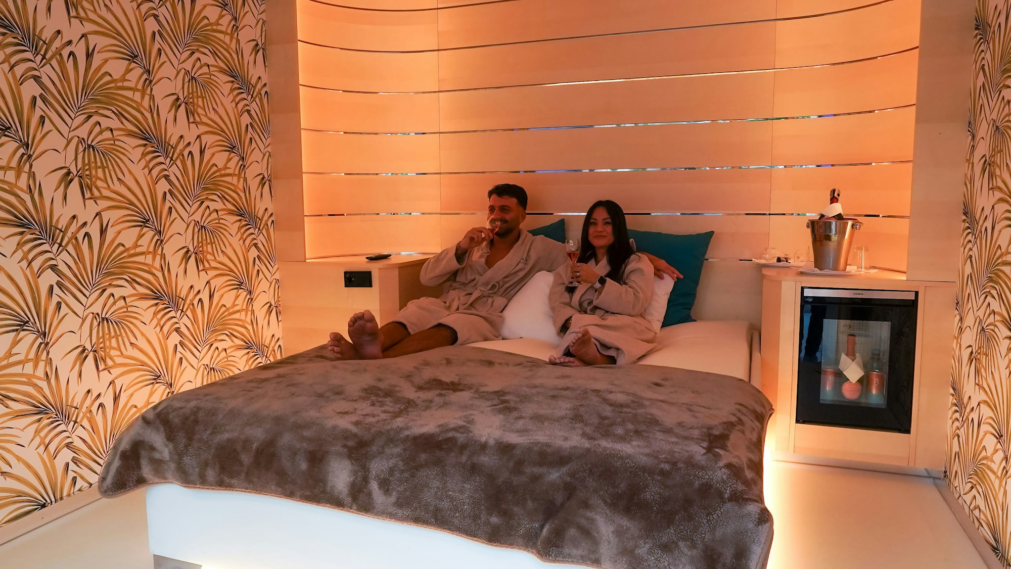 Exklusiv Suite: Machen Sie es sich auf Ihrer Ruheinsel bequem oder entspannen Sie auf gemütlichen Lounge-Sesseln und genießen Sie exklusive Wohlfühlmomente. Ein eigener Kühlschrank hält eine prickelnde Flasche Champagner (Laurent-Perrier Cuvée), zwei Flaschen Wasser sowie zwei Bluphoria Power Drinks für Sie bereit.