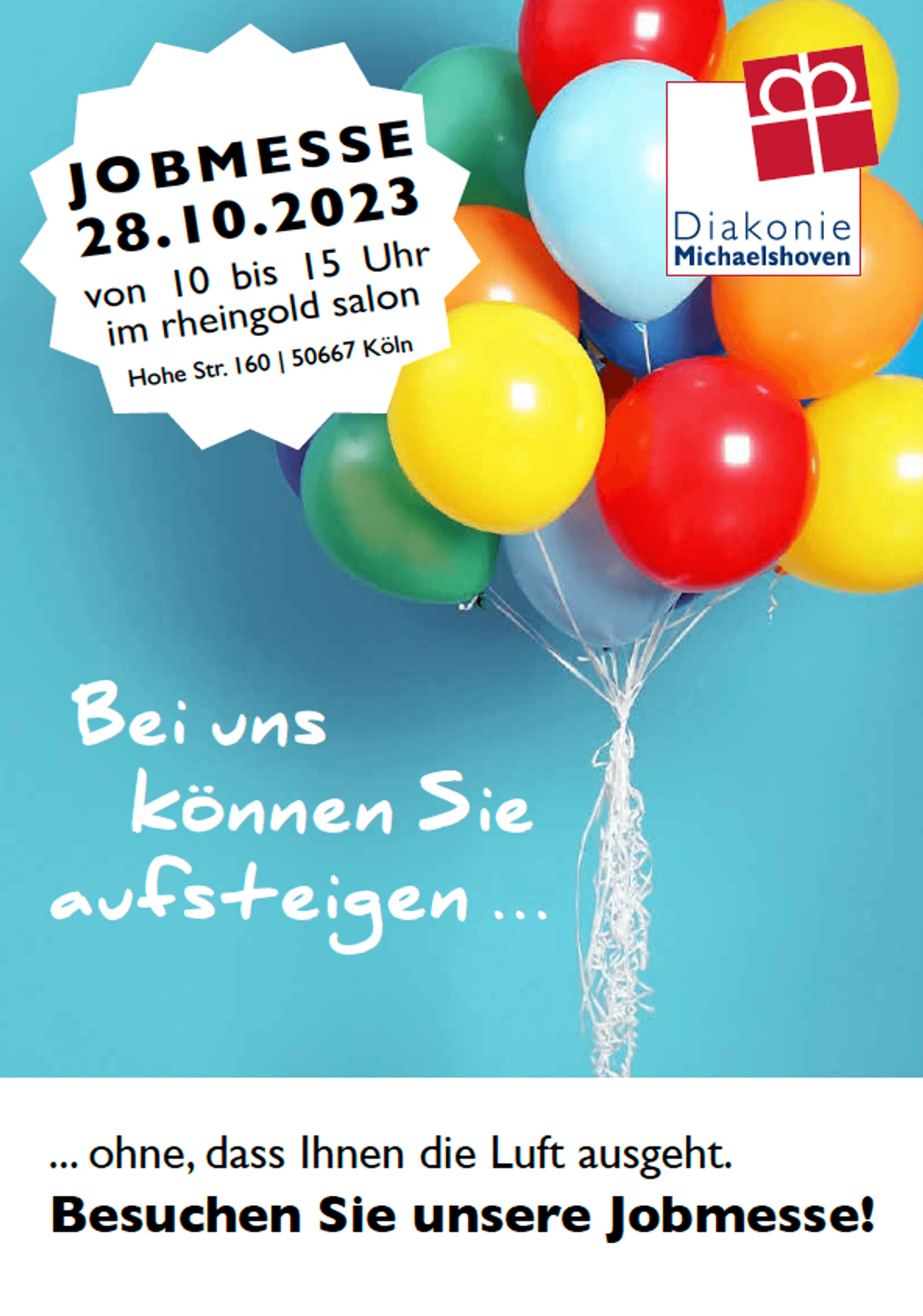 Interesse? Dann kommen Sie zur Jobmesse der Diakonie Michaelshoven am 28. Oktober im Rheingold Salon auf der Hohe Straße 160 in der Kölner Innenstadt und informieren sich über aktuelle Stellenangebote.
