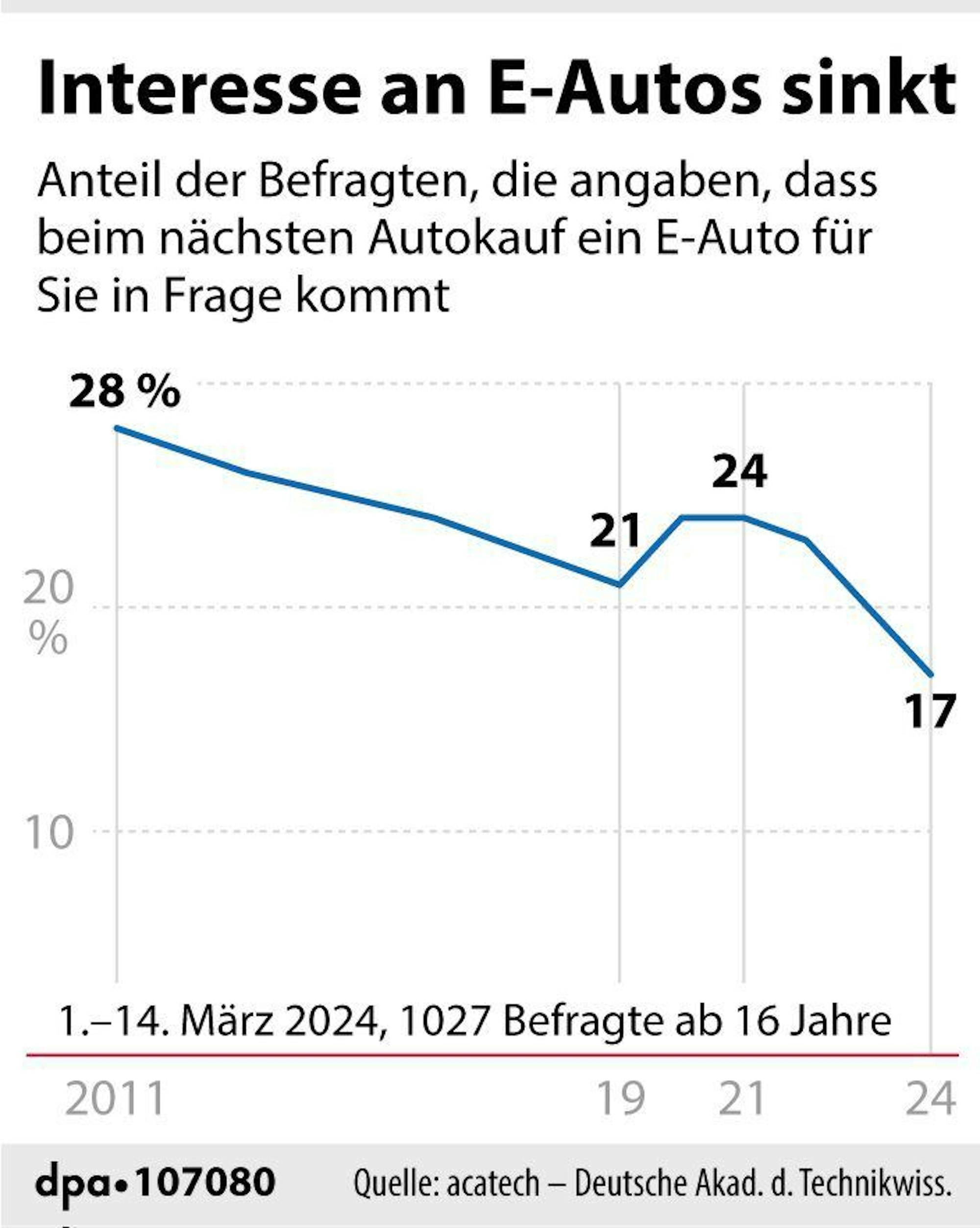 Schlechte Nachrichten für die Elektromobilität: Immer weniger Deutsche ziehen beim nächsten Autokauf einen Stromer in Erwägung. Nur noch 17 Prozent sagten dies in einer aktuellen Allensbach-Umfrage im Auftrag der Deutschen Akademie der Technikwissenschaften (acatech), die am Montag veröffentlicht wurde. Das ist der dritte Rückgang in Folge. Noch 2021 waren es 24 Prozent. Ein zentraler Grund könnte nach Ansicht von Allensbach und acatech mangelnde oder schlechte Information sein.