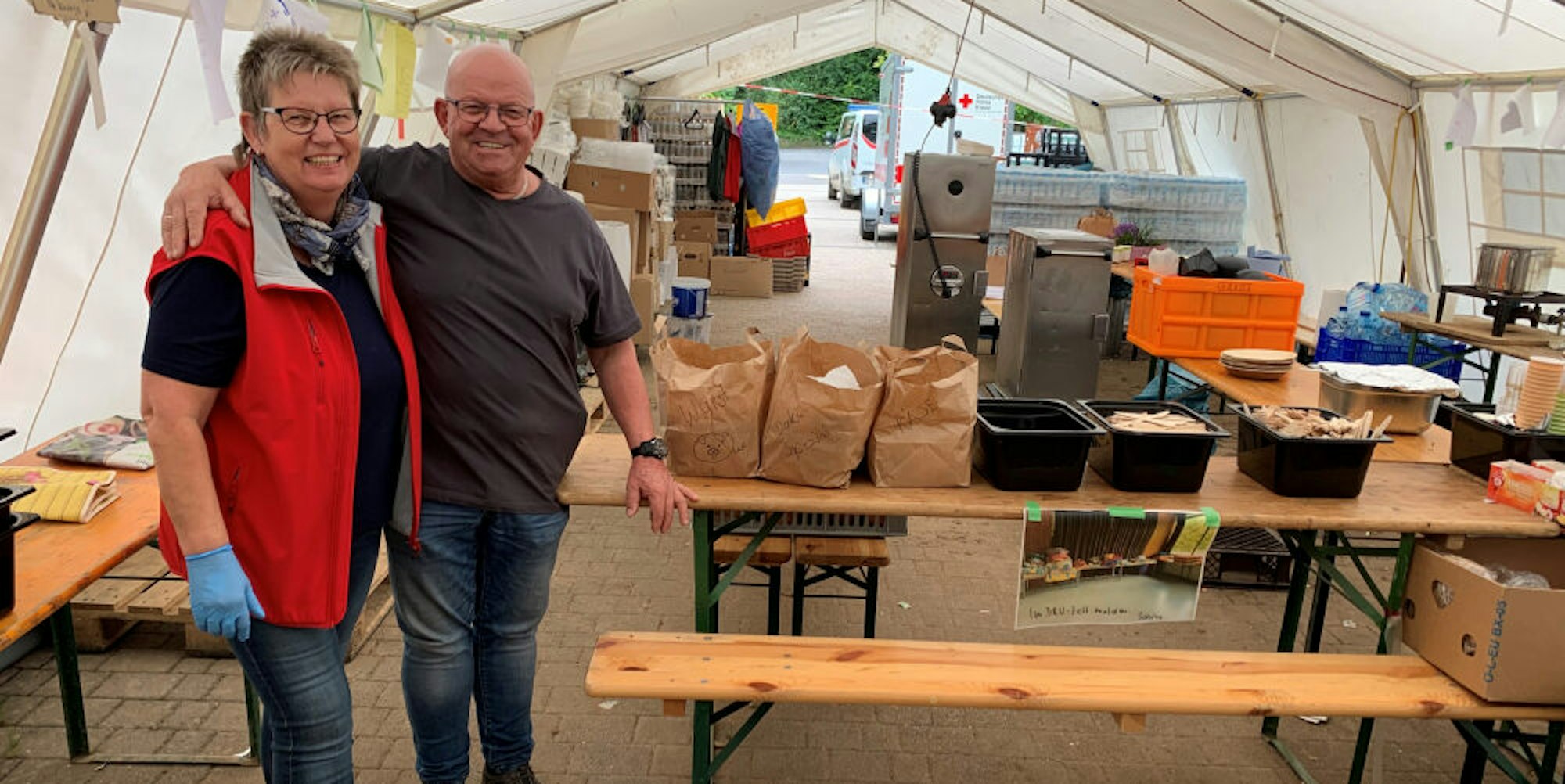 Unmittelbar nach der Flut hatten sie bei der schwer getroffenen evangelischen Kirchengemeinde in Hellenthal geholfen. Am Sonntag danach waren sie beim Corona-Test und überlegten mit den Hellenthaler DRK-lern, wie und wo sie vielleicht helfen könnten. Daheim sitzen und nichts tun wäre ihnen angesichts der Katastrophe unmöglich gewesen. Das Gemünder Verpflegungszelt am Ose wurde ihnen als Ziel genannt. „Da könnten wir mal vorbeischauen“, beschloss das Ehepaar.