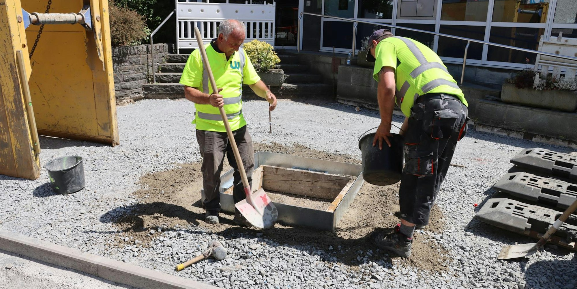 Nur 140 Meter Straße bis hinunter zum Brölbahnkreisel haben die Arbeiter noch vor der Nase. Dann ist der Boulevard Kaiserstraße so gut wie fertig. „Bleiben natürlich ein paar Restarbeiten, an der Bergstraße etwa und an der Gerichtsstraße“, zählt Dresbach auf. Gerade werden die letzten Löcher im Boden gefüllt. Darauf wird die neue Straße Schicht für Schicht aufgebaut.